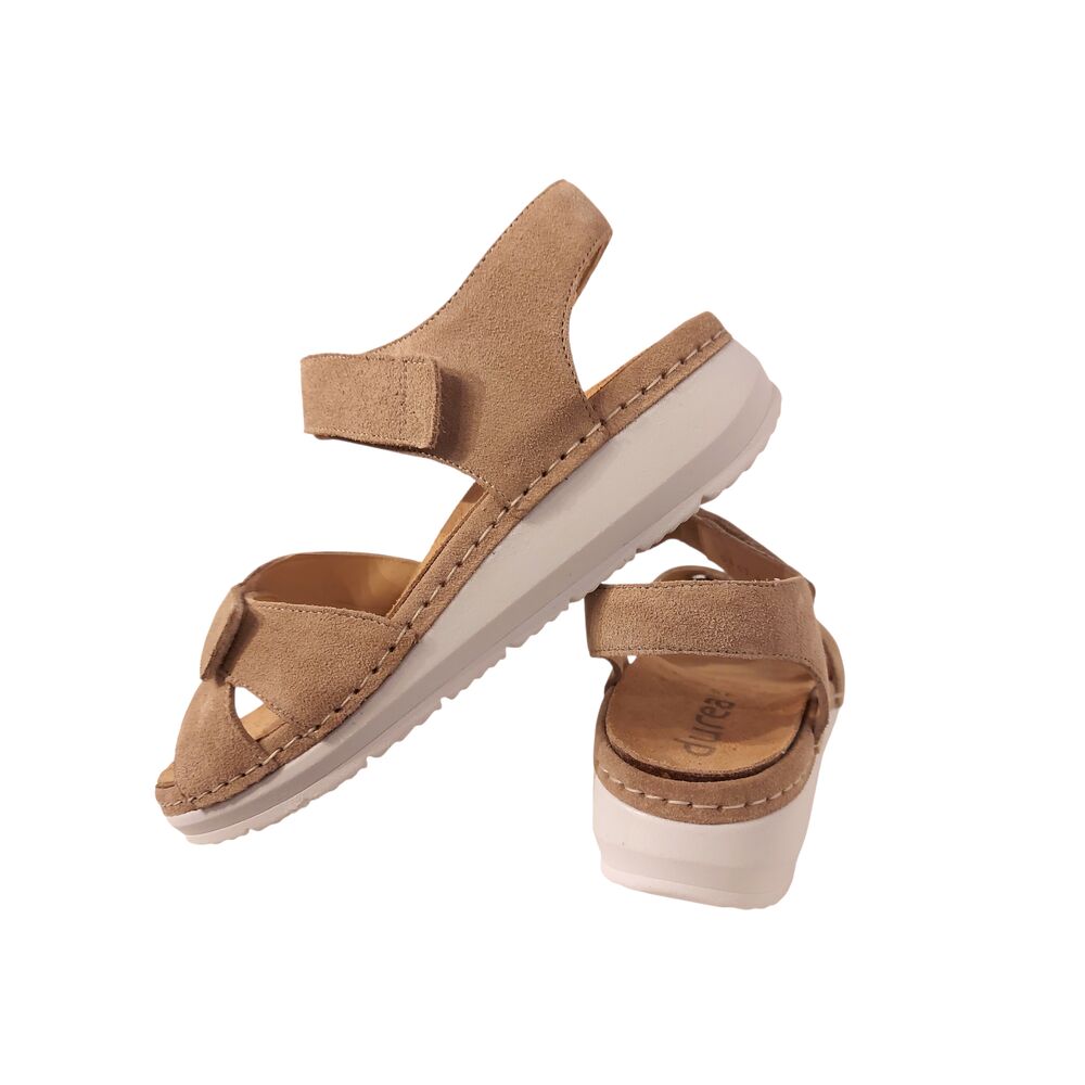 De Durea Sandaal 7432 035 2067 Licht Taupe Wijdte H is een zeer comfortabele sandaal voor dames. Het bovenwerk van de banden is gemaakt van licht taupekleurig suèdeleer. De binnenkant van de banden en het voetbed zijn beide ook geheel van leer. Het voetbed is zeer goed en uitneembaar, zodat er eventueel eigen zolen in gedragen kunnen worden. De sandaal is gemaakt op wijdte H, voor een normale tot iets bredere voet. De sandaal heeft drie banden, waarvan er twee zijn te verstellen met klittenband, zodat de sandaal goed passend gemaakt kan worden voor uw voet! De lichte sleehak geeft extra comfort. Loopcomfort gegarandeerd!