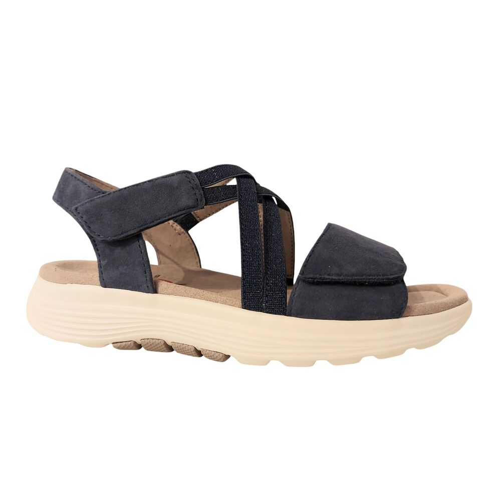 De Gabor Rollingsoft Sandaal 66.813.36 River Blauw is een trendy sandaal met een goede pasvorm. Het bovenwerk is gemaakt van prachtig blauw nubuck leer. De sandaal textiel gevoerd. Ideale pasvorm door de twee verstelbare klittenband banden. Deze eyecatcher is bij veel stijlen te combineren.