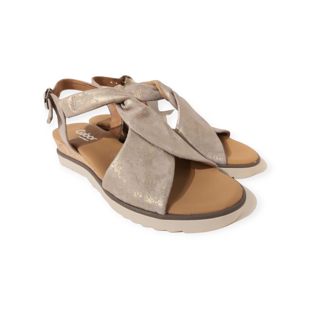 De Gabor Sandaal 62.751.95 Grijs Metallic is een mooie, trendy sandaal met een uitstekende pasvorm. De buitenkant van de sandaal is van prachtig suède leer en de binnenkant is met textiel gevoerd. De sandaal is zeer comfortabel door het goede en zachte voetbed. De kruisbanden zorgen voor een goede pasvorm, te verstellen door de gesp voor een optimale pasvorm. Ook heeft de schoen een mooie lage sleehak, bekleed met kurk, met een hakhoogte van 2,5 cm. De rubberen loopzool heeft goede grip, en draagt zo bij aan een fijn loopcomfort.