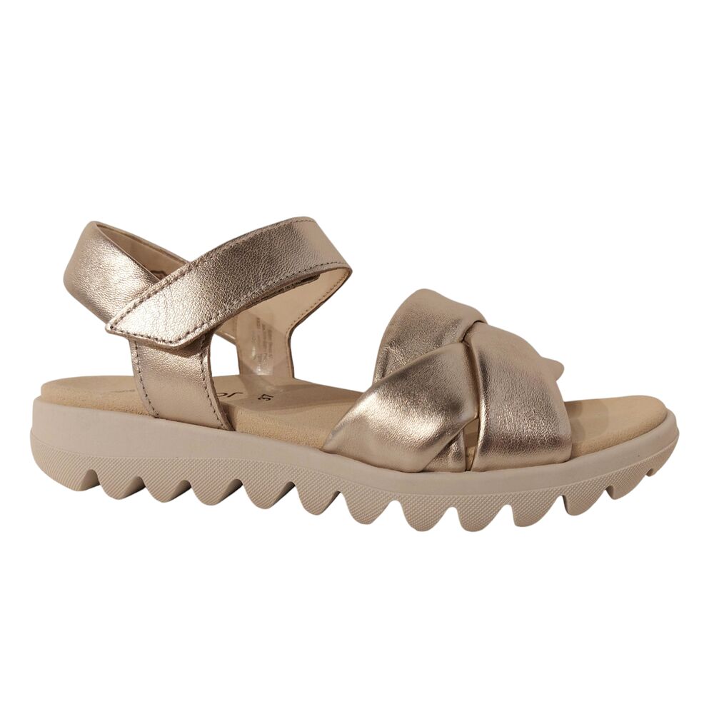 De Gabor Sandaal 64.812.62 Champagne Goud is een mooie, trendy sandaal met een uitstekende pasvorm. De buitenkant van de sandaal is van prachtig gladleer en de binnenkant is met leer en textiel gevoerd. De sandaal is zeer comfortabel door het goede en zachte voetbed. De band over de wreef is te verstellen door middel van klittenband, wat zorgt voor een optimale pasvorm. Ook heeft de schoen een sleehak met een wat grovere zool, en met een hakhoogte van 1,5 cm. De rubberen loopzool heeft goede grip, en draagt zo bij aan een fijn loopcomfort.