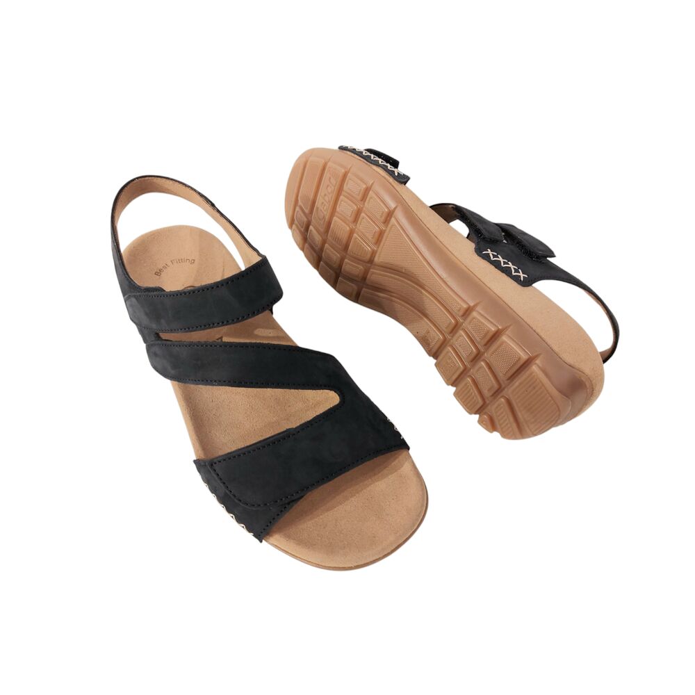 De Gabor Sandaal 83.734.16 Donkerblauw is een mooie, trendy sandaal met een uitstekende pasvorm. De buitenkant van de sandaal is van prachtig nubuck leer en de binnenkant is met textiel gevoerd. De sandaal is zeer comfortabel door het goede en zachte voetbed. De 3 banden zorgen voor een goede pasvorm, te verstellen door klittenband voor een optimale pasvorm. Ook heeft de schoen een mooie lage sleehak, met een hakhoogte van 2 cm. De rubberen loopzool heeft goede grip, en draagt zo bij aan een fijn loopcomfort.