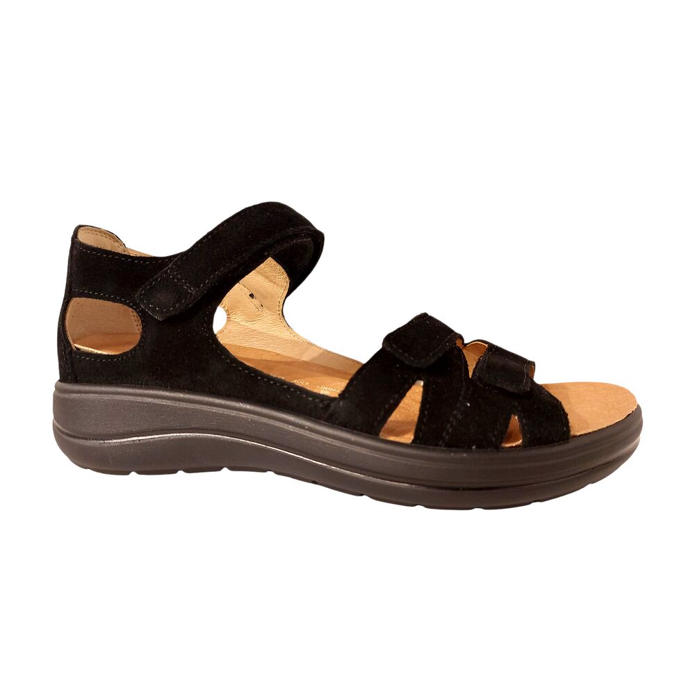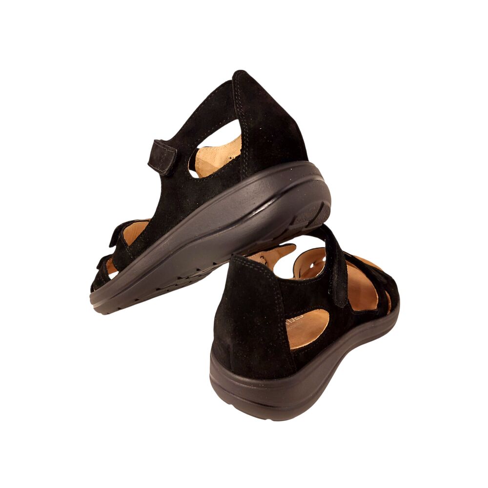 De Hartjes Sandaal 132.2104 30 01.00 Zwart is heerlijke comfortabele sandaal. Het bovenwerk is mooi zwart, suède leer. De voering is van leer. De sandaal heeft 3 klittenbandsluitingen, voor het makkelijk afstellen naar de voet. Het originele voetbed is erg goed, comfortabel en biedt veel steun. Maar het voetbed is ook uitneembaar en kan plaats maken voor een eigen steunzool, zodat de schoen voor iedereen toegankelijk is! De zool is lichtgewicht en draagt bij aan een fijn loopcomfort!
