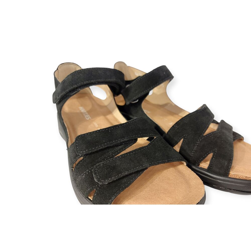 De Hartjes Sandaal 132.2104 30 01.00 Zwart is heerlijke comfortabele sandaal. Het bovenwerk is mooi zwart, suède leer. De voering is van leer. De sandaal heeft 3 klittenbandsluitingen, voor het makkelijk afstellen naar de voet. Het originele voetbed is erg goed, comfortabel en biedt veel steun. Maar het voetbed is ook uitneembaar en kan plaats maken voor een eigen steunzool, zodat de schoen voor iedereen toegankelijk is! De zool is lichtgewicht en draagt bij aan een fijn loopcomfort!
