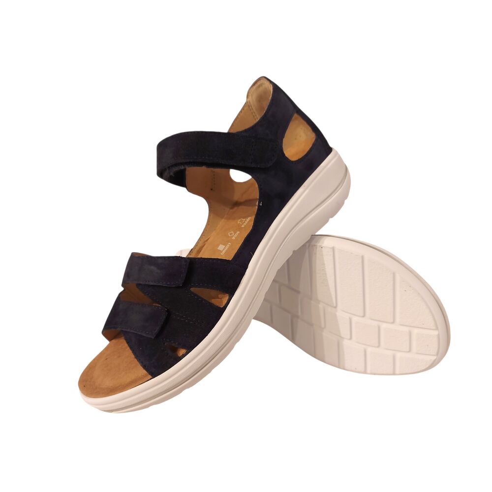 De Hartjes Sandaal 132.2104 30 47.00 Donkerblauw is heerlijke comfortabele sandaal. Het bovenwerk is mooi donkerblauw, suède leer. De voering is van leer. De sandaal heeft drie klittenbandsluitingen, voor het makkelijk afstellen naar de voet. Het originele voetbed is erg goed, comfortabel en biedt veel steun. Maar het voetbed is ook uitneembaar en kan plaats maken voor een eigen steunzool, zodat de schoen voor iedereen toegankelijk is! De zool is lichtgewicht en draagt bij aan een fijn loopcomfort!