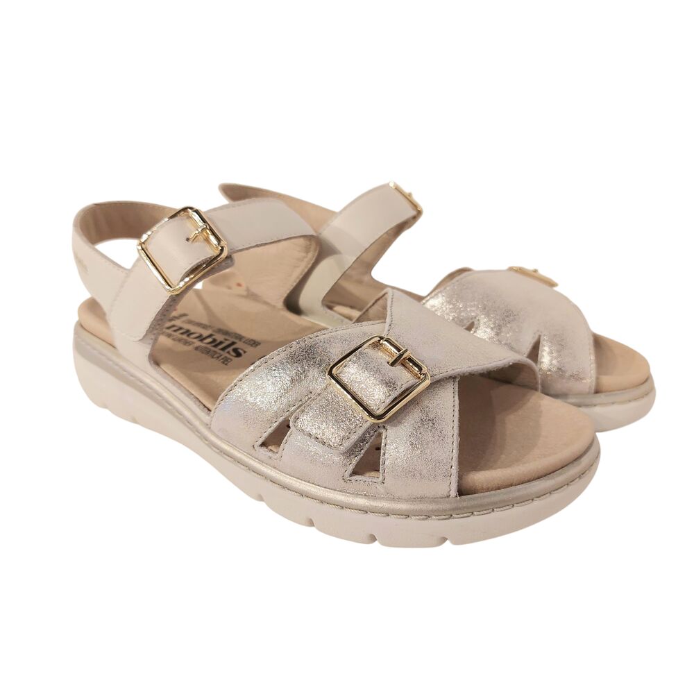 De Mephisto Sandaal Leonna Sand Beige Metallic is een heerlijke comfortabele sandaal voor dames. Het bovenwerk bestaat uit suède en gladleer. De voering is van leer en textiel. Verder heeft de schoen een fijne pasvorm door de banden over de wreef en voorvoet die verstelbaar zijn door middel van klittenband. Door de goede demping, iets waar Mephisto zo bekend om staat, loopt deze schoen werkelijk heerlijk. De schoen bevat namelijk in de hiel een schokabsorberend blok, waardoor schokken worden geabsorbeerd en de rug wordt ontlast. De binnenzolen zijn uitneembaar. De lichtgewicht, rubberen en slijtvaste zool draagt bij aan een geweldig loopcomfort.
