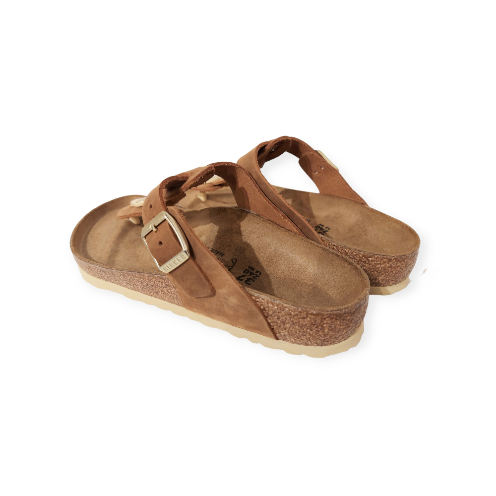 De Birkenstock Gizeh Braided Teenslippers Breed is een leuke teenslipper voor dames met een goed voetbed. Het bovenwerk is van Leer en in de kleur cognac . De band over de wreef is verstelbaar met een gesp. Het kurken voetbed is leer bekleed. De zool is van het materiaal EVA*.