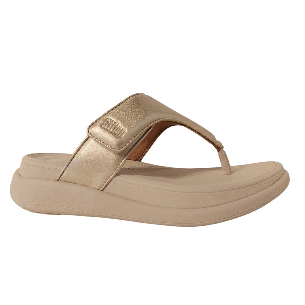 De Fitflop Slipper F-Mode Go Adjustable Flatform Toe-Post Platino Goud is een trendy slipper voor dames. Het bovenwerk is van mooi goudkleurig leer. Verder bevat de binnenkant een heerlijk zachte voering. De band over de voet is verstelbaar, d.m.v. klittenband, waardoor de slipper geschikt is voor elke voet. Deze slipper heeft de legendarische, ergonomische Microwobbleboard™ tussenzool. Dit houdt in dat de zool drie levels van zachtheid heeft. Bij de hiel zit een stevige zool voor een goede demping, in het midden voelt het heerlijk zacht voor een optimaal comfort en als laatste heeft het een medium zachtheid bij de tenen voor een goede grip. De slipper heeft een plateau van 4 cm. Met een slijtvaste antislip zool. Kortom, dé slipper voor onder al je kledingstijlen deze zomer!