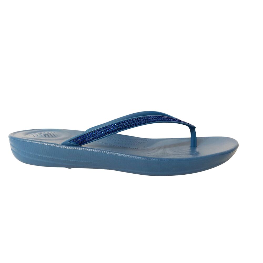 De Fitflop Slipper Iqushion Sparkle French Blue Blauw is een trendy slipper voor dames. Deze slipper heeft de legendarisch, ergonomische zool die perfect past onder de voet. Dankzij de iQushion-zool wordt de druk onder de voet verspreidt en de natuurlijke bewegingen van het lichaam aangevuld. De impactkussentjes verlaagd de belasting op de drukpunten, ideaal voor mensen met hielspoor. Met een slijtvaste antislip zool, gemaakt van natuurlijk rubber. Het materiaal van de slipper is TPU en kan daardoor goed tegen water. Kortom, dé slipper voor onder al je kledingstijlen deze zomer.