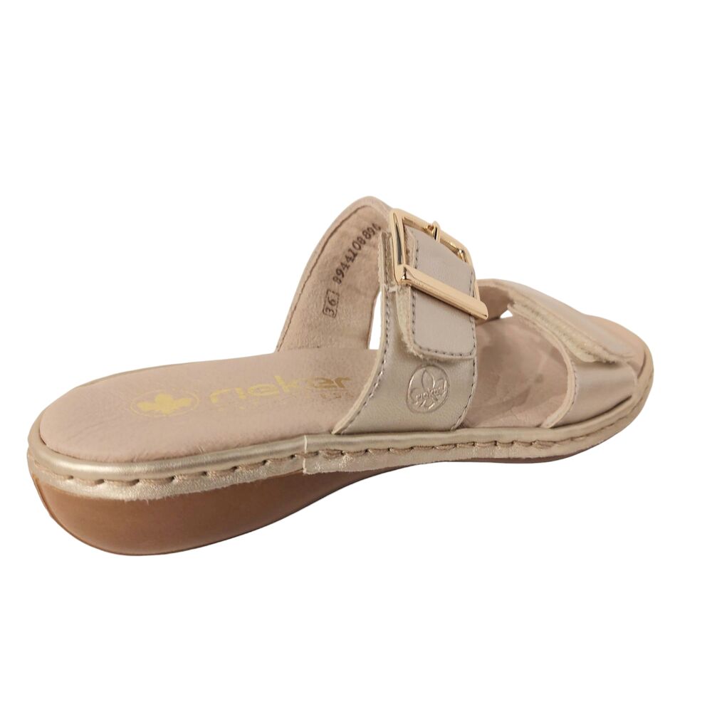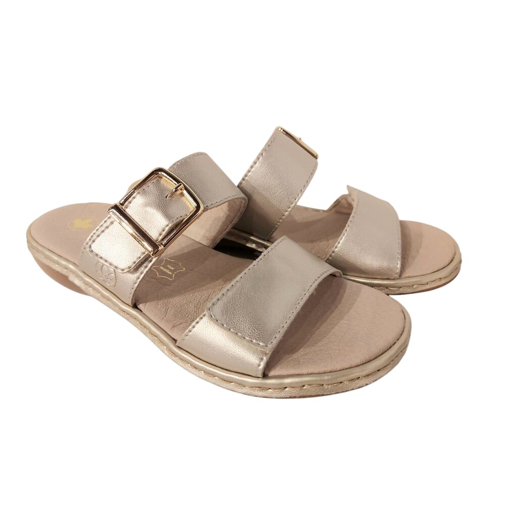 De Rieker Slipper 656957-90 Goud is een trendy en comfortabele slipper voor dames. Het voetbed is lekker zacht. De slipper van leer. De banden van de slipper zijn beide te verstellen met klittenband. De lichtgewicht zool geeft goede grip en draagt zo bij aan een fijn loopcomfort!