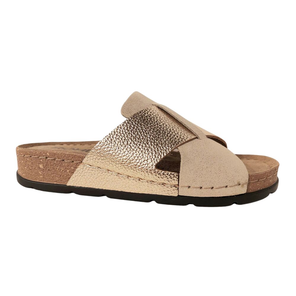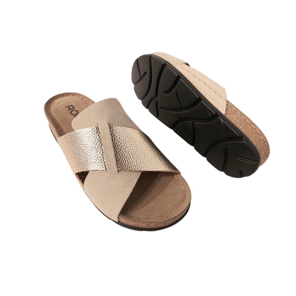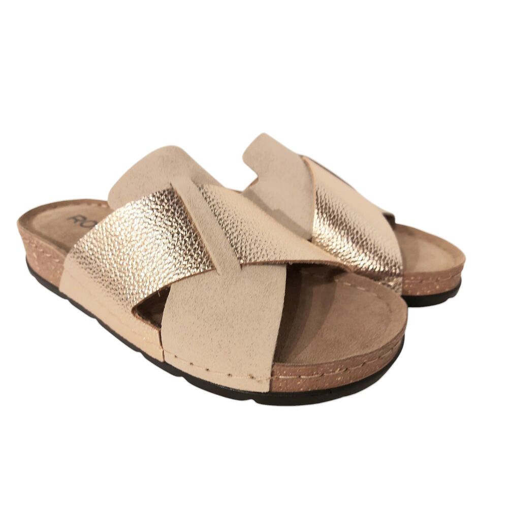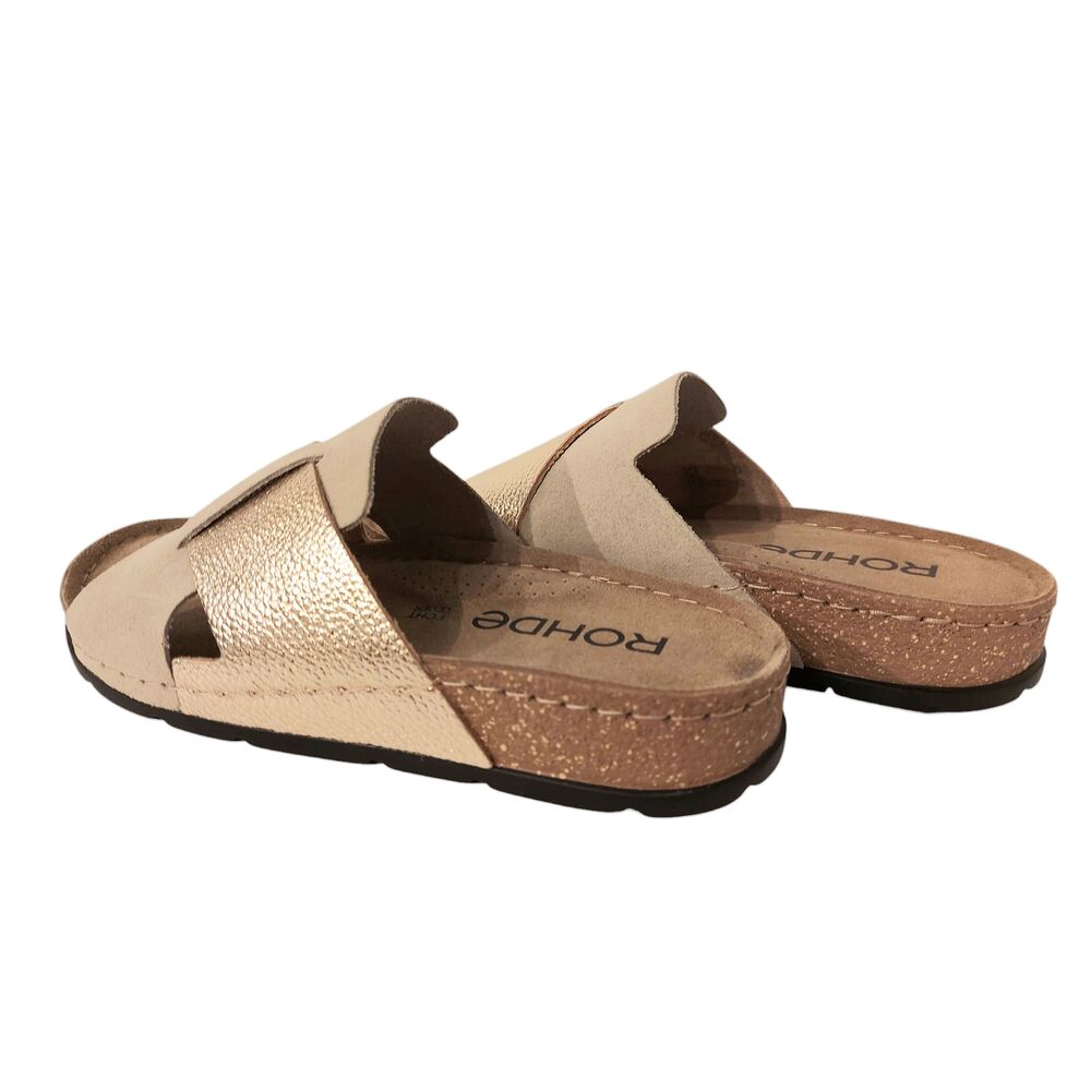 De Rohde Slipper 5410 Gold Zand, is een uiterst comfortabele slipper voor dames. De lederen voering voelt prettig om de voet en het bovenwerk is van mooi goed en zandkleurig leer. De schoen is gemaakt met een wijdte G, voor de normale voet.