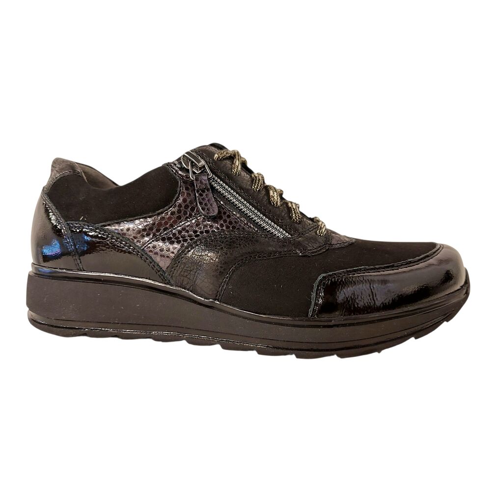 De Durea Sneaker 6279 685 1140 Zwart Wijdte H is een heerlijke comfortabele schoen. Het bovenwerk van leer en metallic in een zwarte kleur. de voering is volledig van leer. De sneaker heeft een vetersluiting én een rits, voor een makkelijke instap. De schoen is gemaakt op wijdte H, voor een iets bredere voet. Het originele voetbed is erg goed, comfortabel en biedt veel steun. Maar het voetbed is ook uitneembaar, en kan plaats maken voor een eigen inlegzool, zodat de schoen voor iedereen toegankelijk is! De zool is lichtgewicht en draagt bij aan een fijn loopcomfort!