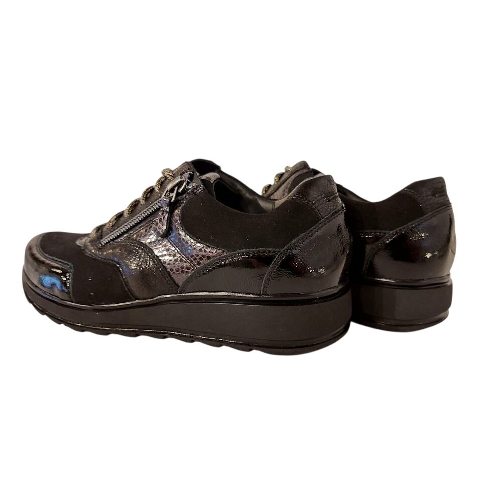 De Durea Sneaker 6279 685 1140 Zwart Wijdte H is een heerlijke comfortabele schoen. Het bovenwerk van leer en metallic in een zwarte kleur. de voering is volledig van leer. De sneaker heeft een vetersluiting én een rits, voor een makkelijke instap. De schoen is gemaakt op wijdte H, voor een iets bredere voet. Het originele voetbed is erg goed, comfortabel en biedt veel steun. Maar het voetbed is ook uitneembaar, en kan plaats maken voor een eigen inlegzool, zodat de schoen voor iedereen toegankelijk is! De zool is lichtgewicht en draagt bij aan een fijn loopcomfort!