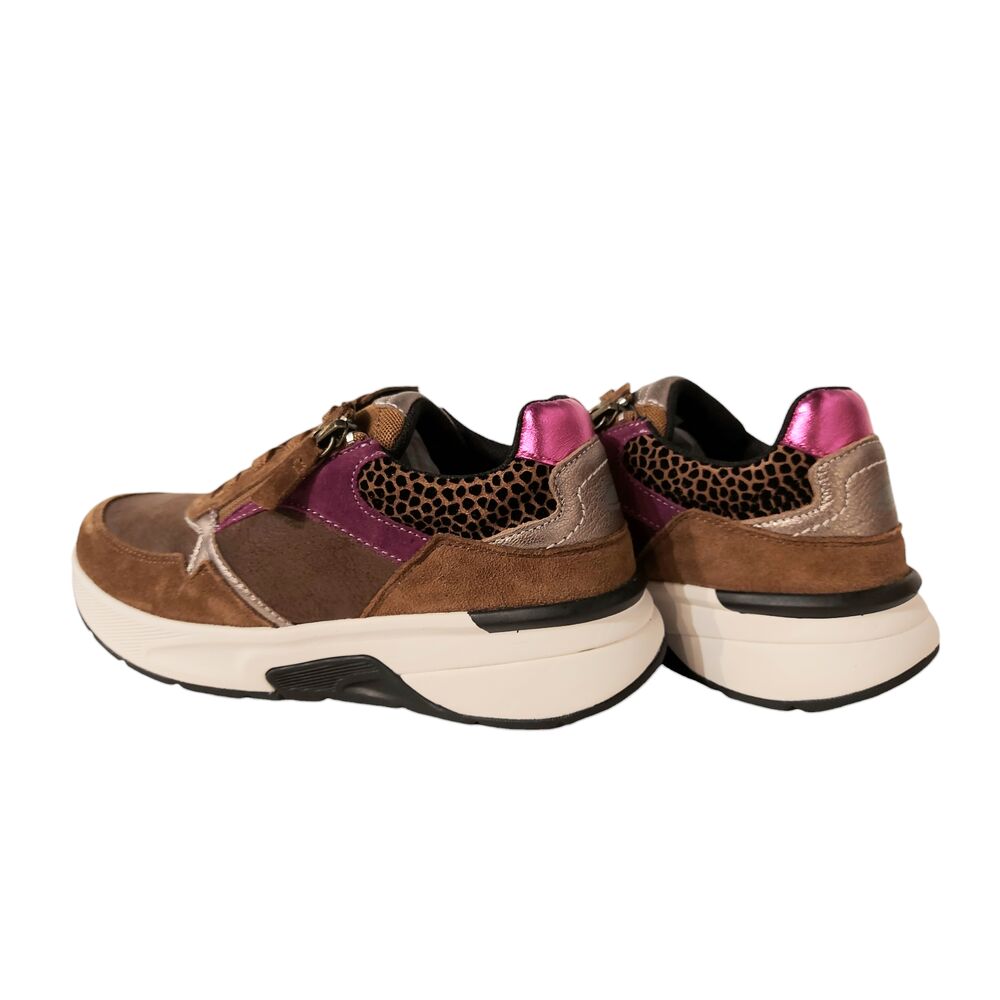 De Gabor Rollingsoft Sneaker 56.847.63 Cognac Roze Combi is een prachtige trendy sneaker met een goede pasvorm. Het bovenwerk is van suède leer in een cognac en roze kleur met een subtiel printje. De sneaker is textiel gevoerd en heeft een uitneembaar voetbed zodat er eventuele steunzolen in gedragen kunnen worden. De sneaker heeft een vetersluiting. Deze eyecatcher is bij veel stijlen te combineren.