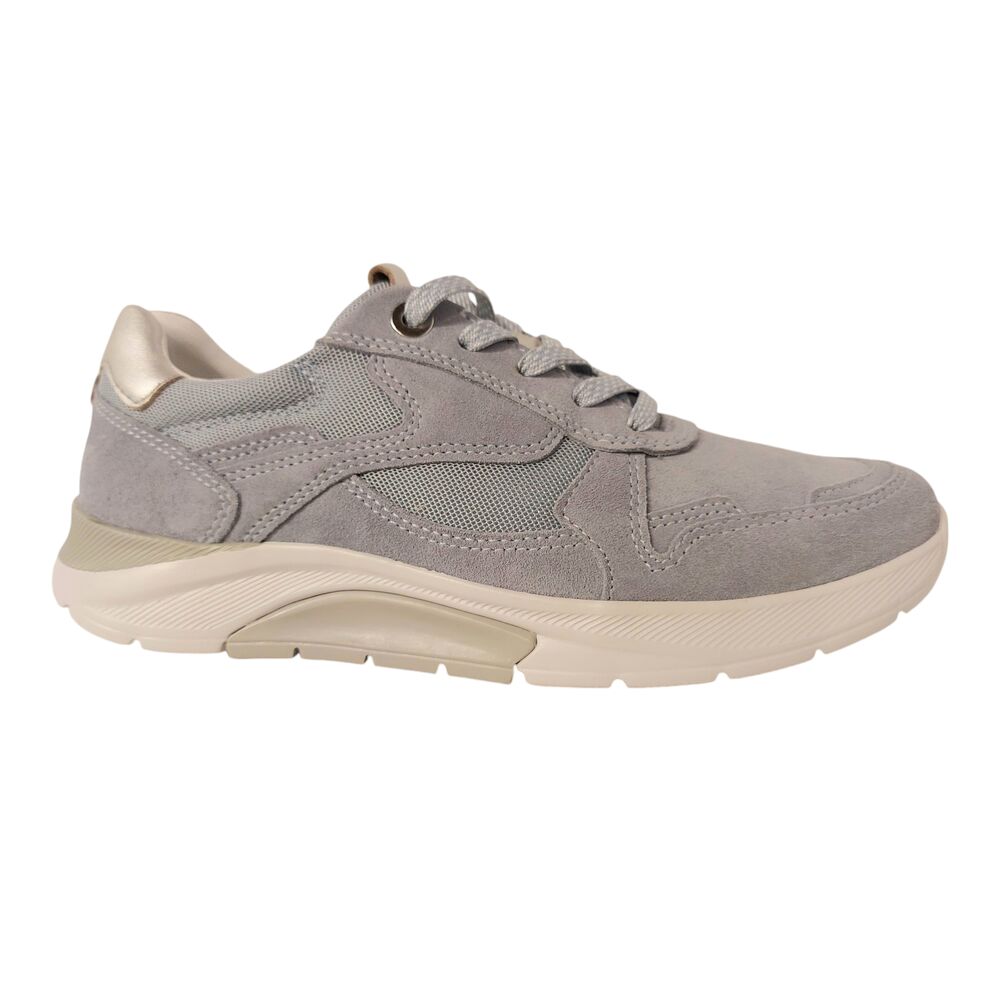 De Gabor Rollingsoft Sneaker 66.925.36 Lagune Zilver Lichtblauw is een prachtige trendy sneaker met een goede pasvorm. Het bovenwerk is van suède leer in een lichtblauwe kleur. De sneaker is textiel gevoerd en heeft een uitneembaar voetbed zodat er eventuele steunzolen in gedragen kunnen worden. De sneaker heeft een vetersluiting. Deze eyecatcher is bij veel stijlen te combineren.