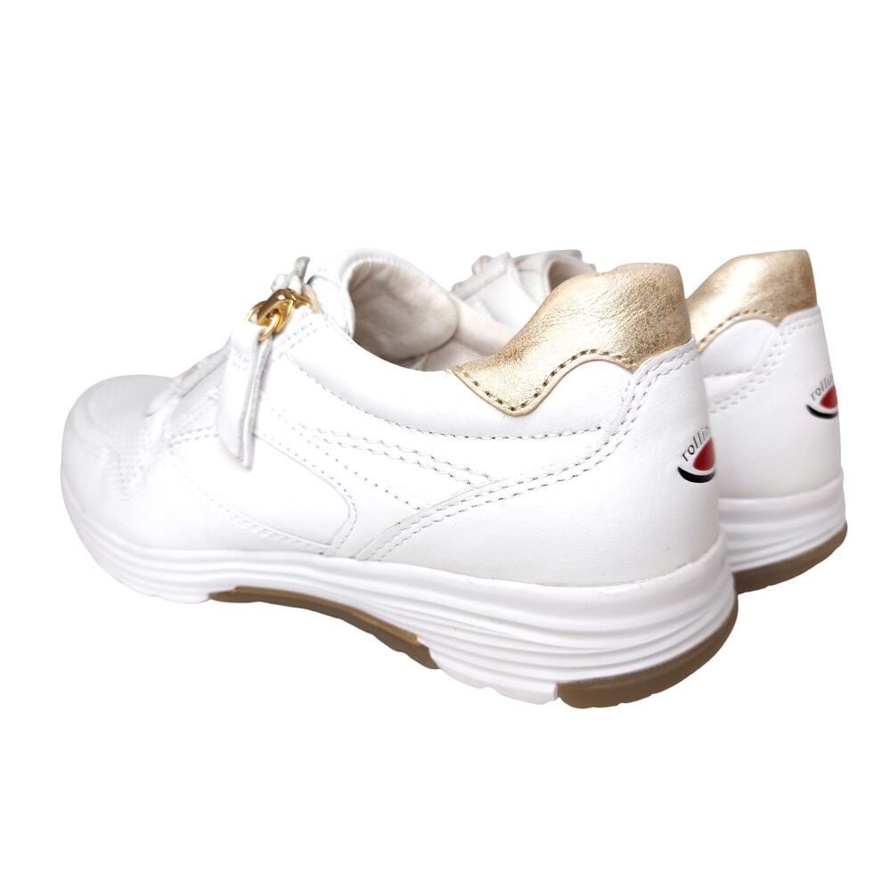 De Gabor Rollingsoft Sneaker 66.978.51 Wit Glad Leer is een prachtige sportieve sneaker met een goede pasvorm. Het bovenwerk is mooi wit glad leer gecombineerd met subtiele goudkleurige details. De sneaker is zowel met leer als textiel gevoerd en heeft een uitneembaar voetbed zodat er eventuele steunzolen in gedragen kunnen worden. Naast de vetersluiting heeft de sneaker ook een rits, voor een makkelijke instap én een trendy look. De sportieve loopzool is licht van gewicht, geeft goede demping en bevorderd de afwikkeling van de voet. Loopcomfort gegarandeerd!.