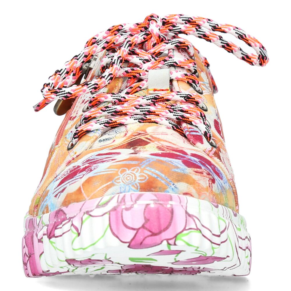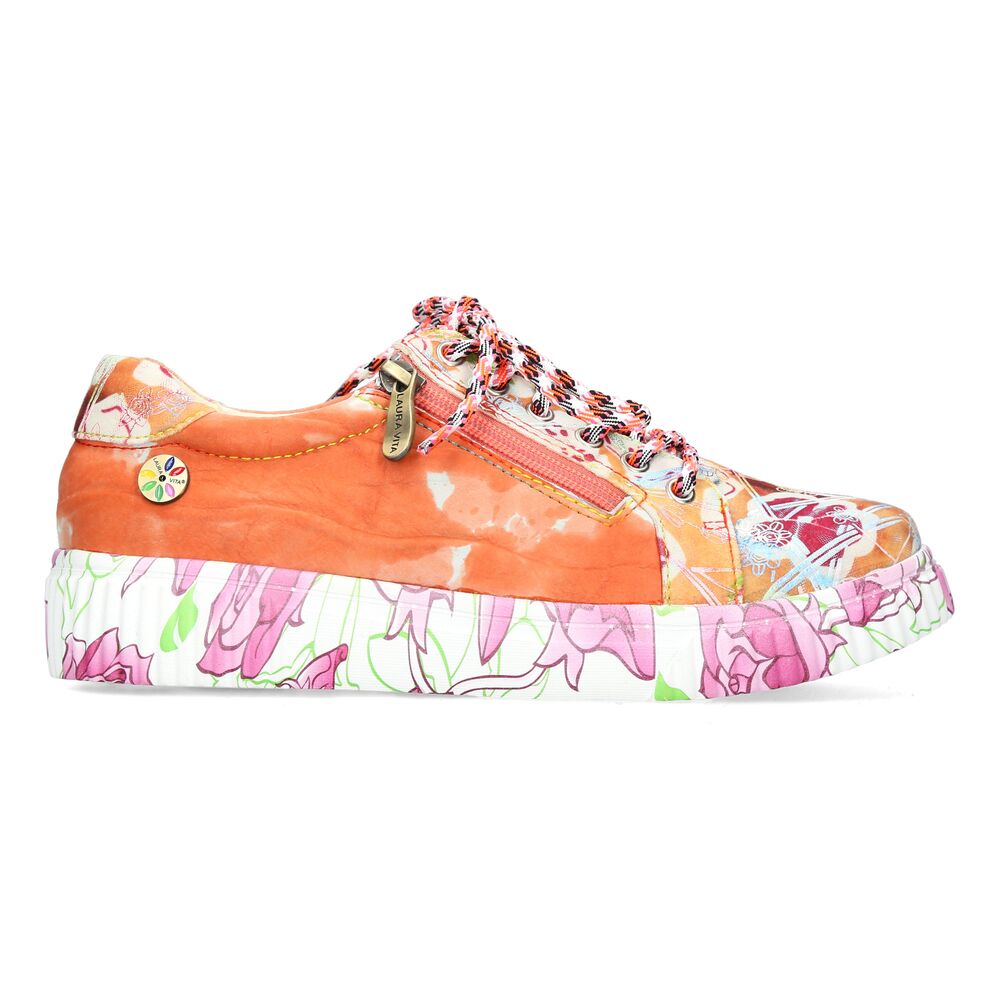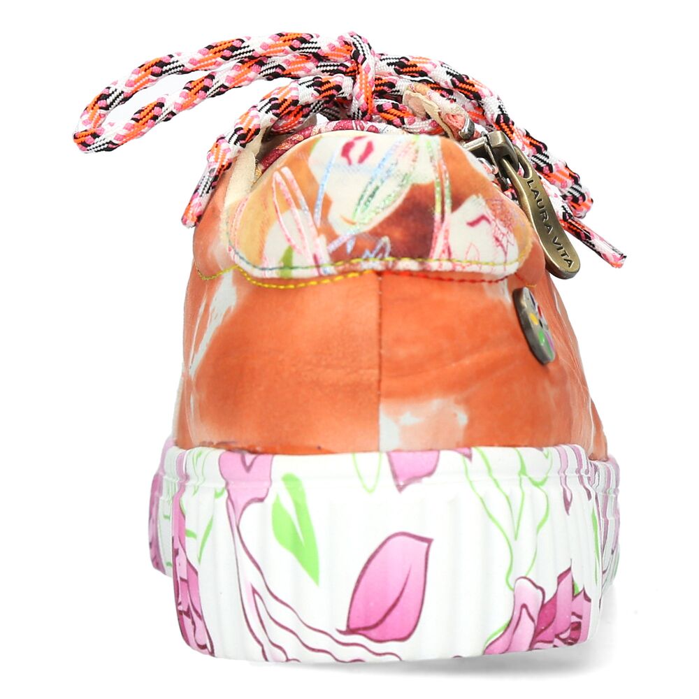 De Laura Vita Limited Sneaker Soleno 02 SL2165-2 Oranje is een prachtige sneaker voor dames. Het bovenwerk bestaat uit de kleur oranje met een vrolijk printje. Het buitenwerk is een combinatie van leer en textiel. De binnenvoering is geheel van leer. De sneaker heeft een rubberen loopzool en is daarnaast ook uitgevoerd met veters voor een ideale pasvorm. De kleurcombinatie samen met de vormgeving maakt ook dit model weer een echte eyecatcher!.