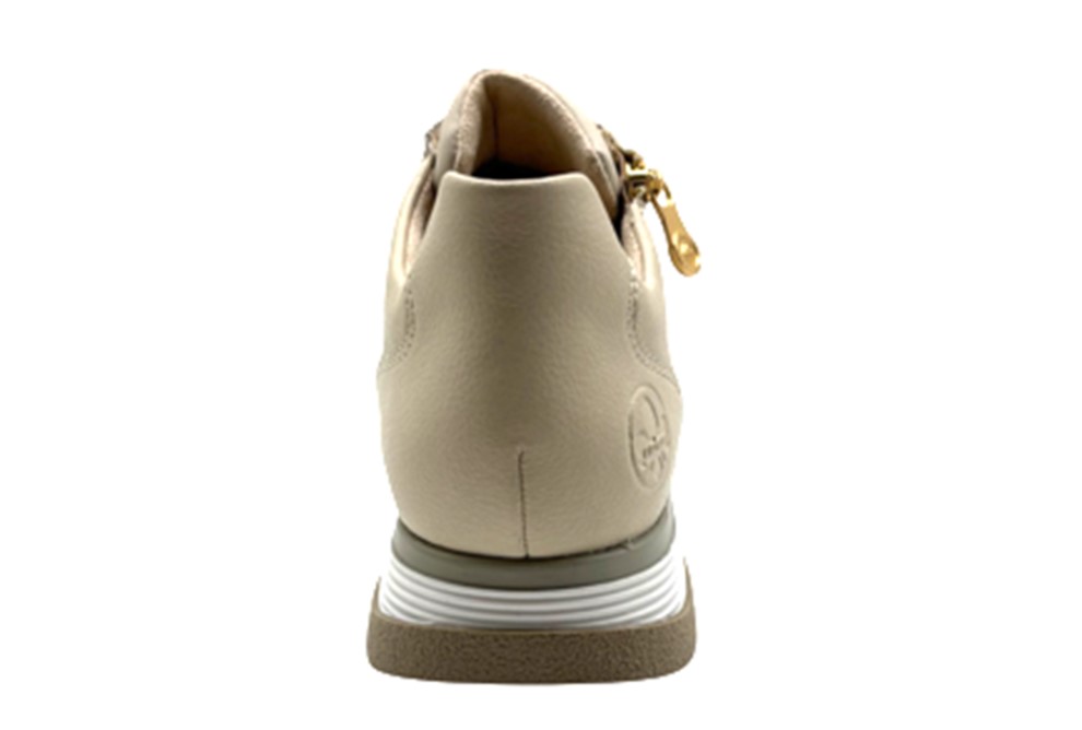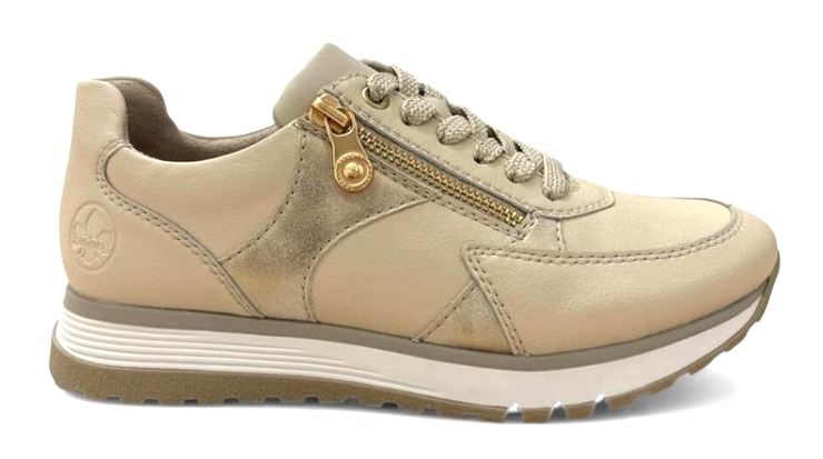 De Rieker Sneaker 49010-60 Beige Verwisselbaar Voetbed is een trendy sneaker met een goede pasvorm. Het bovenwerk is mooi beige gladleer. Afgewerkt met goudkleurige details. De rits zorgt voor een makkelijke instap. De sneaker is textiel gevoerd, het voetbed is leer bekleed. Het voetbed is heerlijk zacht en ook verwisselbaar, zodat ze uitermate geschikt zijn om er eigen inlegzolen in te kunnen dragen. De sneaker heeft een vetersluiting én een rits, voor een makkelijke instap en een trendy look. Met een trendy zool van lichtgewicht materiaal. Super fijn loopcomfort!