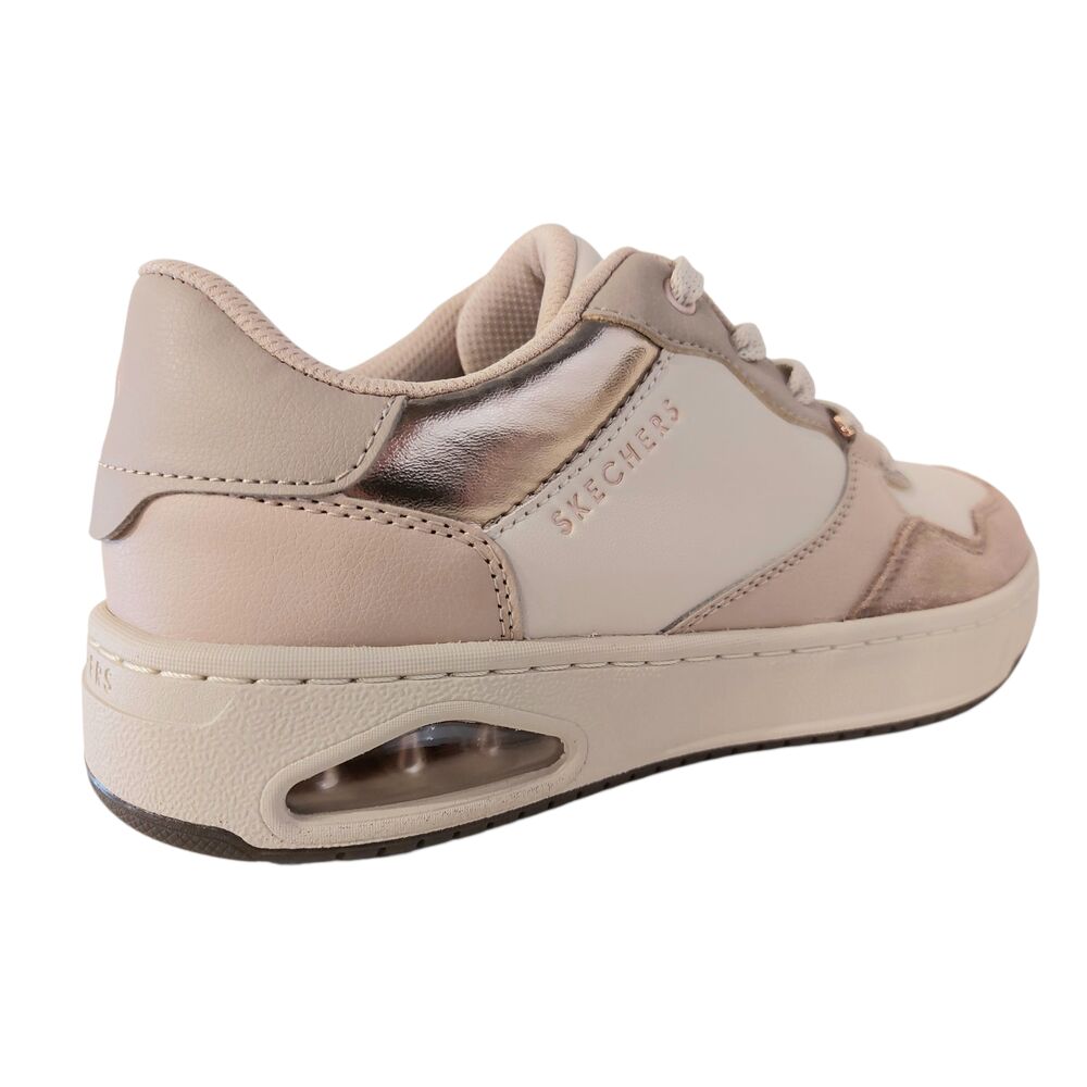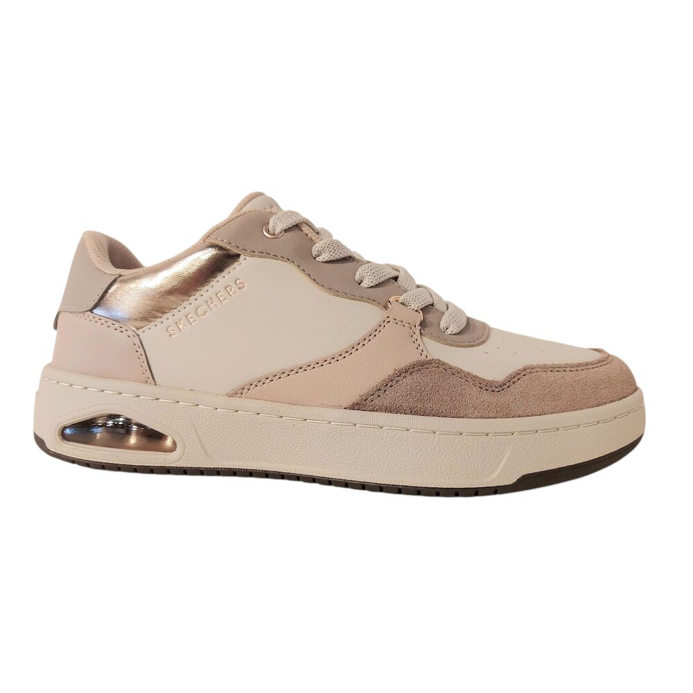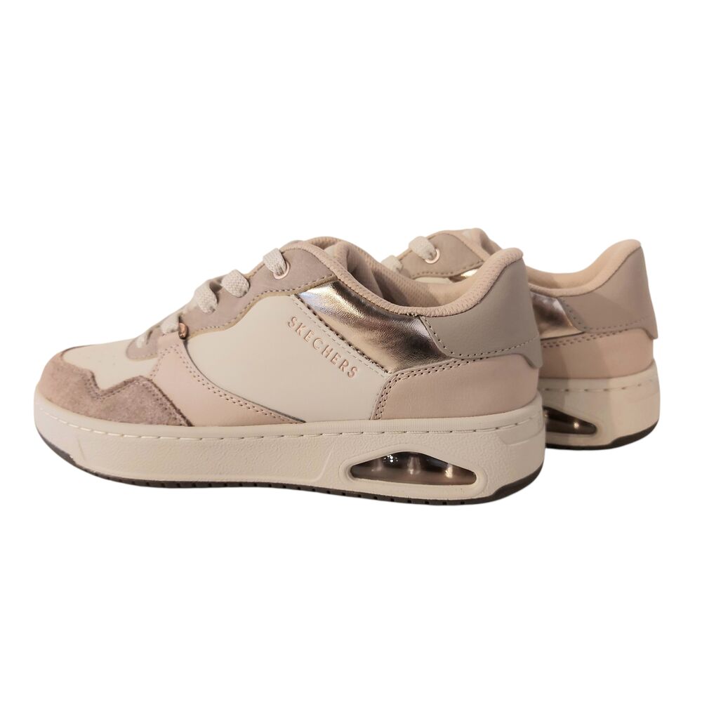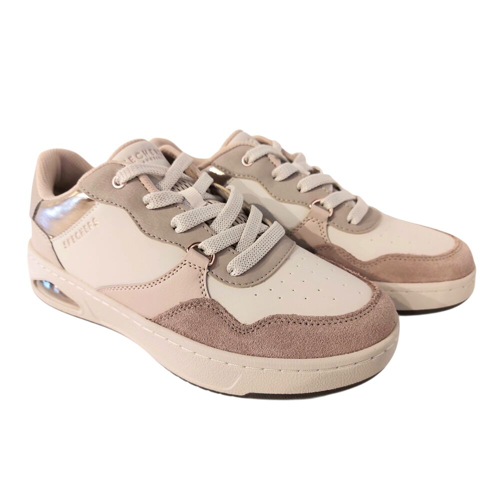 De Skechers Sneaker 177815-TPMT UNO Off White Taupe is een heerlijk comfortabele sneaker voor dames. Het bovenwerk van de schoen is gemaakt van leer in combinatie met wit synthetisch materiaal. Bovendien zorgen de mooie perforatieaccenten op de neus voor een verkoelend effect. De binnenkant van de sneaker is gemaakt van textiel met een gewatteerde kraag en tong. Bovendien heeft de sneaker een Air-Cooled Memory Foam voetbed. Dit houdt in dat het voetbed gelijk comfort en goede demping geeft, maar daarnaast wel ademend blijft. Met memory foam voor een optimaal comfort. Verder heeft de sneaker een tussenzool met een zichtbaar air gedempt schokabsorberend hakkussen. Tot slot heeft de schoen een flexibele gripzool voor de beste loopcomfort. Kortom een uiterst comfortabele sneaker.