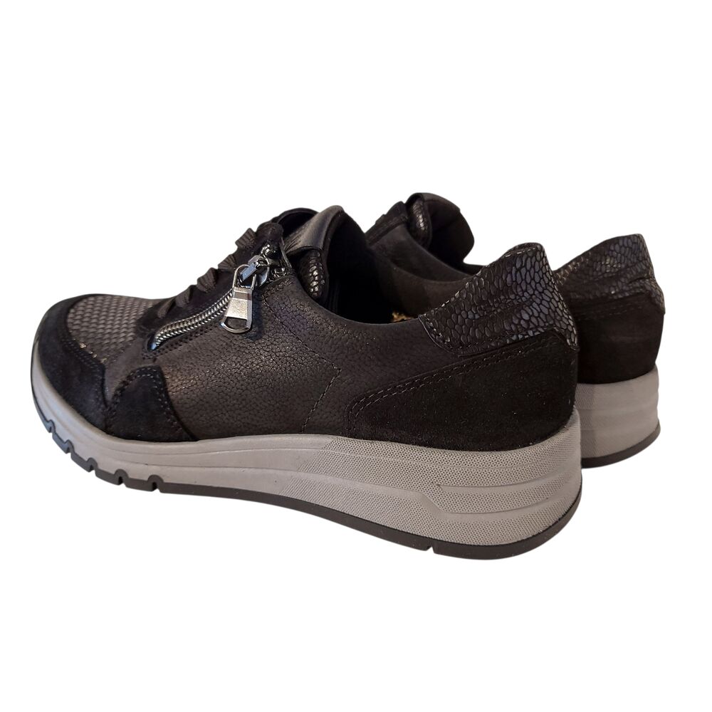 De Waldlaufer Bungeez Sneaker 957H02 500 001 H Zwart is een sneaker met een uitstekende pasvorm. Het bovenwerk is mooi zwart nubuck, gecombineerd met stretch in een subtiele print. Met een zachte binnenvoering. De sneaker zit en loopt fantastisch! Met een uitneembaar voetbed, zodat er eventueel eigen zolen in gedragen kunnen worden. De schoen is gemaakt op wijdte H, voor een bredere voet. Naast de vetersluiting heeft de sneaker ook een rits, voor een makkelijke instap. De rubberen loopzool geeft goede demping en draagt bij aan een geweldig loopcomfort! Een ideale schoen voor een gevoelige voet.