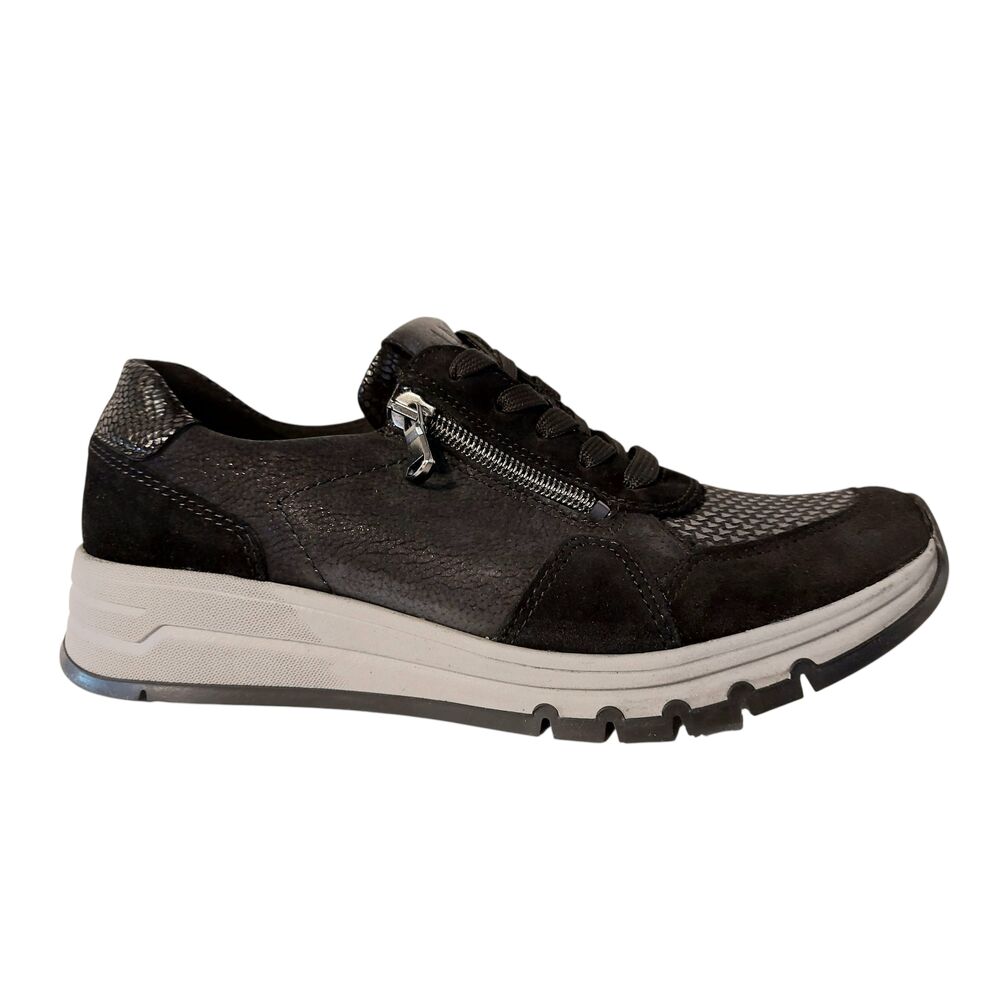 De Waldlaufer Bungeez Sneaker 957H02 500 001 H Zwart is een sneaker met een uitstekende pasvorm. Het bovenwerk is mooi zwart nubuck, gecombineerd met stretch in een subtiele print. Met een zachte binnenvoering. De sneaker zit en loopt fantastisch! Met een uitneembaar voetbed, zodat er eventueel eigen zolen in gedragen kunnen worden. De schoen is gemaakt op wijdte H, voor een bredere voet. Naast de vetersluiting heeft de sneaker ook een rits, voor een makkelijke instap. De rubberen loopzool geeft goede demping en draagt bij aan een geweldig loopcomfort! Een ideale schoen voor een gevoelige voet.