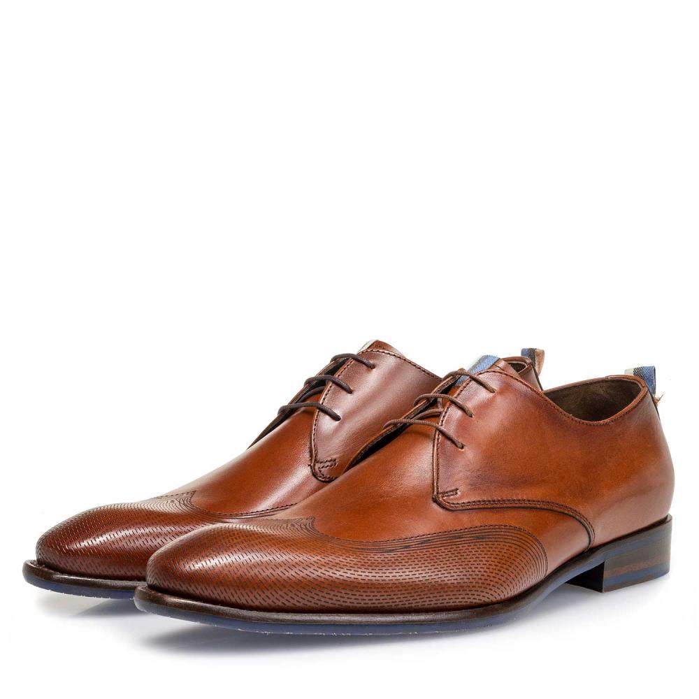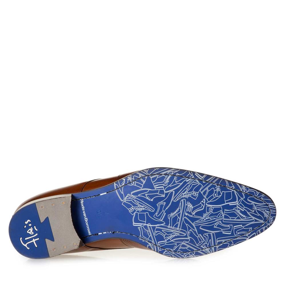 De Floris Van Bommel Nette Schoen SFM-30144-24-01 Cognac of ook gezegd De Stapper 06.00 is een mooie klassieke veterschoen. Het bovenwerk is gemaakt van prachtig cognac, glad kalfsleer. Verder is de schoen ook volledig leer gevoerd. Ook heeft de schoen een Goodyear-maakwijze. Met een rubberen loopzool waar subtiel grijs in verwerkt is en antislip om het loopcomfort te optimaliseren. Gemaakt op wijdte g en half voor een normale voet. Gewoon een prachtschoen die niet in uw garderobe mag ontbreken.