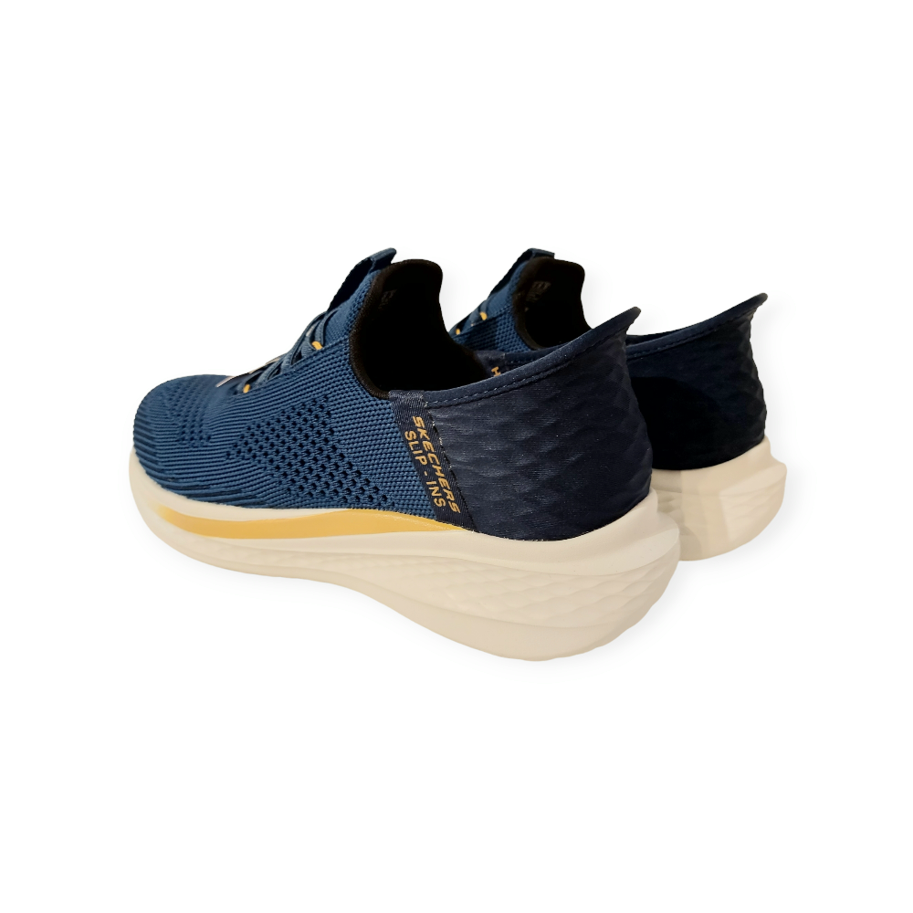 De Skechers Instapper Hands-Free Slip-Ins 210810 BLU Blauw Machine Washable is een heerlijk comfortabele instapper voor heren. Het bovenwerk van de schoen is gemaakt van blauw textiel, met perforatiegaten voor een verkoelend effect. De binnenkant van de schoen is gemaakt van textiel met een gewatteerde kraag. Bovendien heeft de sneaker een Goga Mat Arch® voetbed met Memory Foam. Dit betekend dat de schoen naar uw voet zal gaan staan en uw voet zo optimaal zal ondersteunen, maar daarnaast wel ademend blijft. Met Memory Foam voor een optimaal comfort. Deze instapper is een Stretch Fit®-instappermodel voor sokachtig comfort en voor een gemakkelijke instap. Door de elasticiteit en de grote instap kunt u deze schoen aandoen zonder een schoenlepel of uw handen erbij te gebruiken. Daarnaast is deze schoen ook nog eens Machine Washable, te wassen in de wasmachine. De schoen heeft daarnaast ook een stevige gripzool. Zo biedt deze instapper de ultieme oplossing voor comfort de hele dag door.