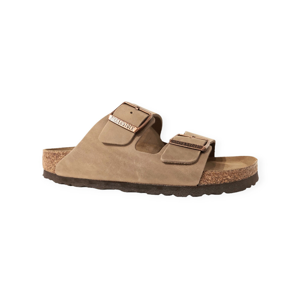 De Birkenstock Arizona Slippers 0552813 Tabacco Brown Leer Smal is een mooie slipper met een goede pasvorm. Dit is de smalle variant. Het bovenwerk is mooi, taupe kleurig, gevet leer. De slipper heeft 2 brede banden die verstelbaar zijn door middel van gespen. De slipper heeft een goed, voorgevormd voetbed. Het kurken voetbed is leer bekleed. De zool is van het materiaal EVA*.