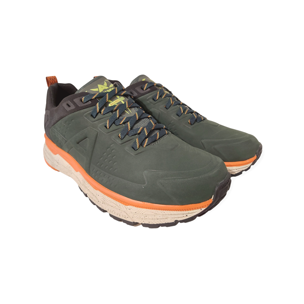 De Allrounder Outdoor Wandelschoen Alando-TEX Bottle Groen Zwart Oranje is een sportieve wandelschoen voor heren. Het bovenwerk is gemaakt van de beste kwaliteit leer, gecombineerd met textiel en de binnenkant is textiel gevoerd. Bovendien heeft de schoen een ALLRO TEX voering, deze technologie biedt optimale bescherming tegen vocht en heeft daarnaast een uitstekend ademend vermogen. Verder heeft de schoen een heerlijk zacht anatomische voetbed wat schokken beperkt tot een minimum, maar die eventueel ook uitneembaar is zodat er eventuele steunzolen in gedragen kunnen worden. Het heeft een zachte vulling, wat een perfecte ondersteuning van de hele voet garandeert. De schoen heeft een multifunctionele 100% rubberen zool, met een speciaal profiel die goede demping geeft, de hiel beschermt en loopcomfort gegarandeerd!