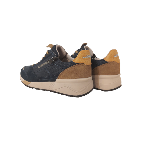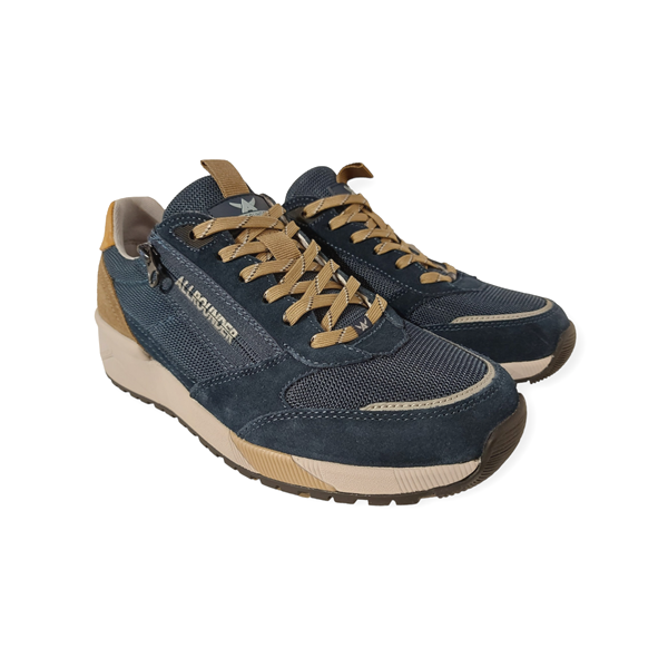 De Allrounder Sneakers Scarmaro Dress Blue is een sportieve sneaker voor heren. Het bovenwerk bestaat uit een combinatie van suède leer en textiel in de kleuren blauw, met donker taupe details. De voering is van textiel. Verder heeft de schoen een heerlijk zacht anatomische voetbed wat schokken beperkt tot een minimum, maar die eventueel ook uitneembaar is zodat er eventuele steunzolen in gedragen kunnen worden. Daarnaast heeft de sneaker naast een veter ook een rits, wat de instap vergemakkelijkt. De schoen heeft een stoere sportieve rubberen zool die ook goede demping geeft en de hiel beschermt. Loopcomfort gegarandeerd!