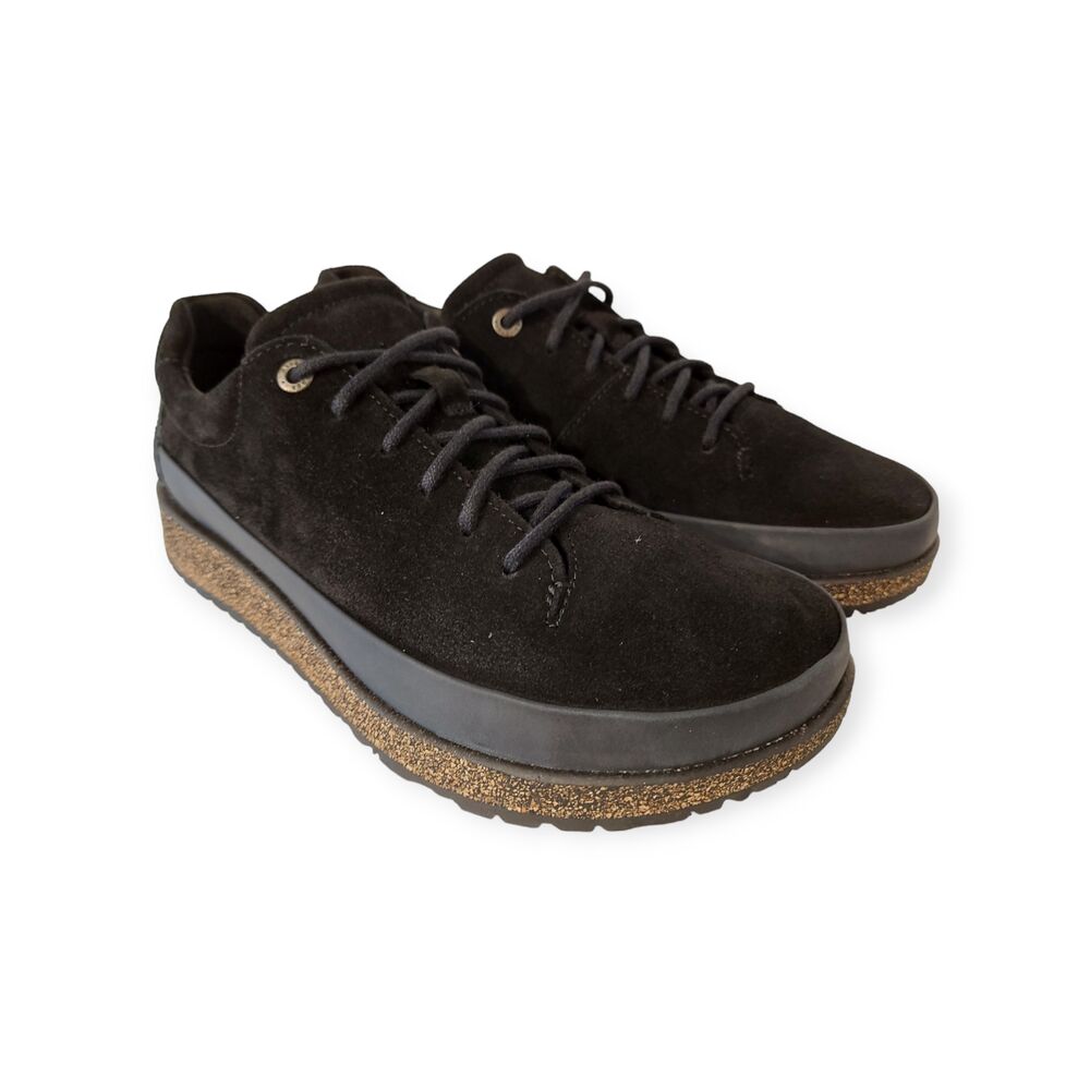 De Birkenstock Sneaker Honnef Low 1019771 Zwart is een leuke veterschoen voor heren of dames. Het bovenwerk is gemaakt van suède leer in een zwarte kleur. Ook heeft de schoen een gepolsterde rand. en de binnenkant is gemaakt van leer. Bovendien heeft de schoen een anatomisch gevormd voetbed die eventueel uitneembaar is. De zool is gemaakt van natuurrubber. Verder heeft de schoen een smal tot normale breedte. Goede pasvorm door de veter. Loopcomfort gegarandeerd.
