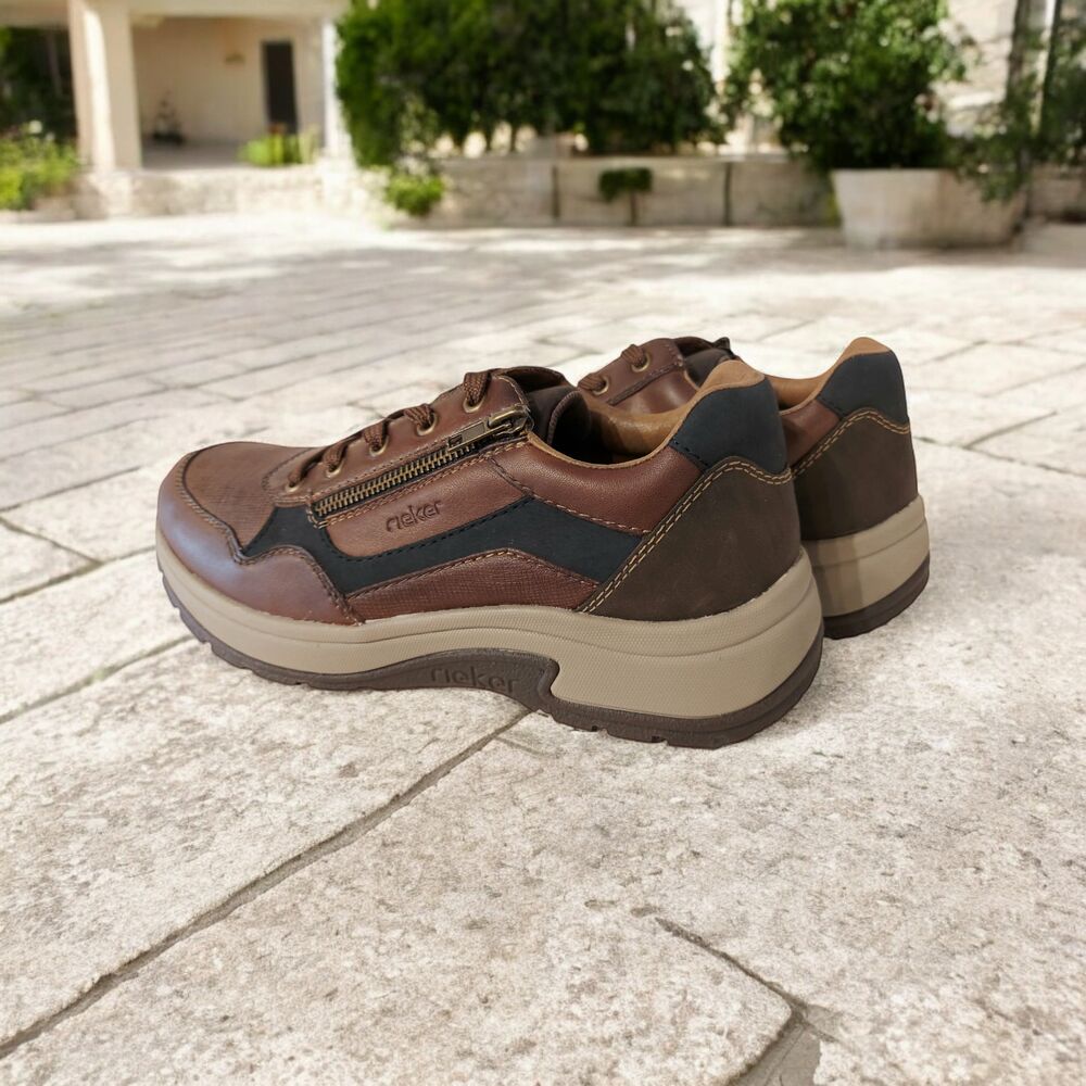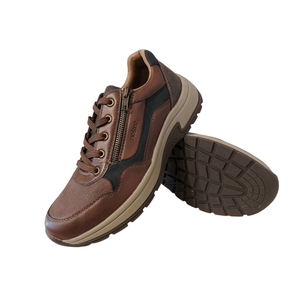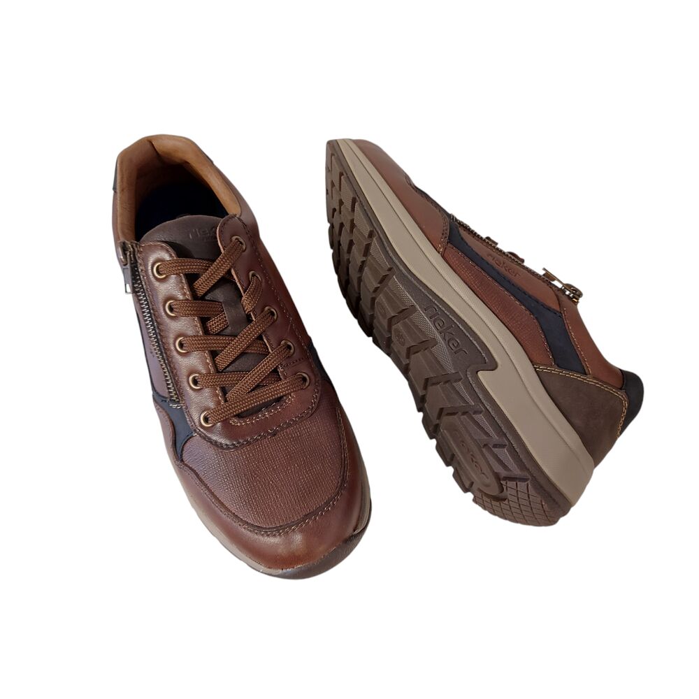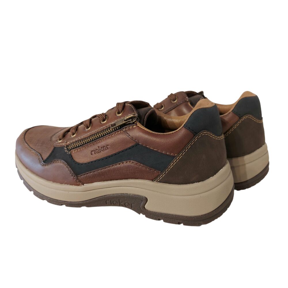 De Rieker Sneaker 11001-25 Bruin Combi Wijdte H is een mooie sneaker voor heren. De schoen heeft een fijne pasvorm door de vetersluiting. Ook bevat de schoen leuke blauwe details. Verder is de buitenkant van de schoen gemaakt van leer en de voering is van textiel. Het voetbed is uitneembaar zodat er eventueel eigen zolen in kunnen worden gedragen. Gemaakt voor de bredere voet. De soepele en lichtgewicht zool draagt bij aan een fijn loopcomfort!