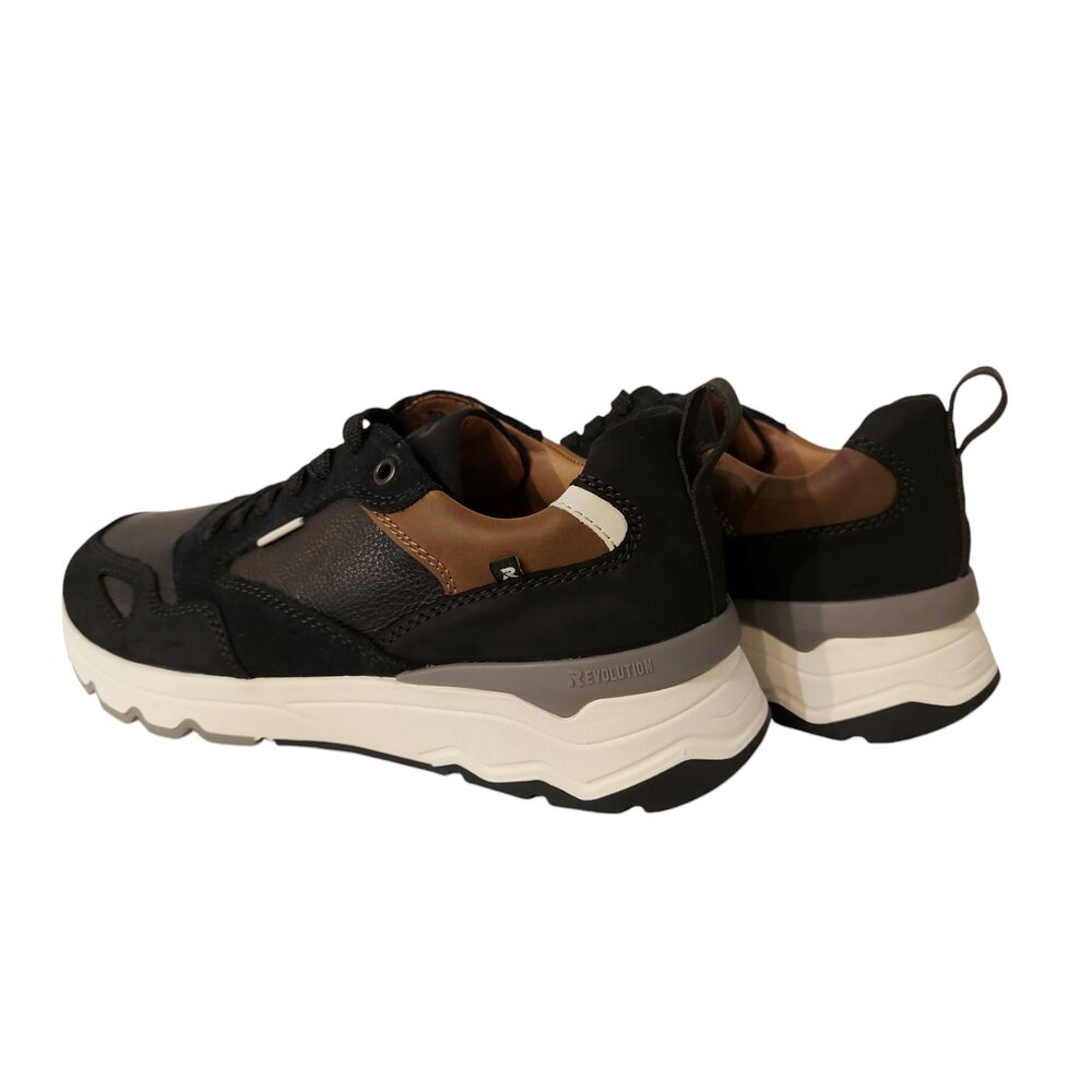 De Rieker Sneaker U0903-00 Zwart Cognac is een mooie sneaker voor heren. De schoen heeft een fijne pasvorm door de vetersluiting. Verder is de buitenkant van de schoen gemaakt van nubuck leer en imitatieleer en de voering is van textiel. Het voetbed is uitneembaar zodat er eventueel eigen zolen in kunnen worden gedragen. De soepele en lichtgewicht zool draagt bij aan een fijn loopcomfort!