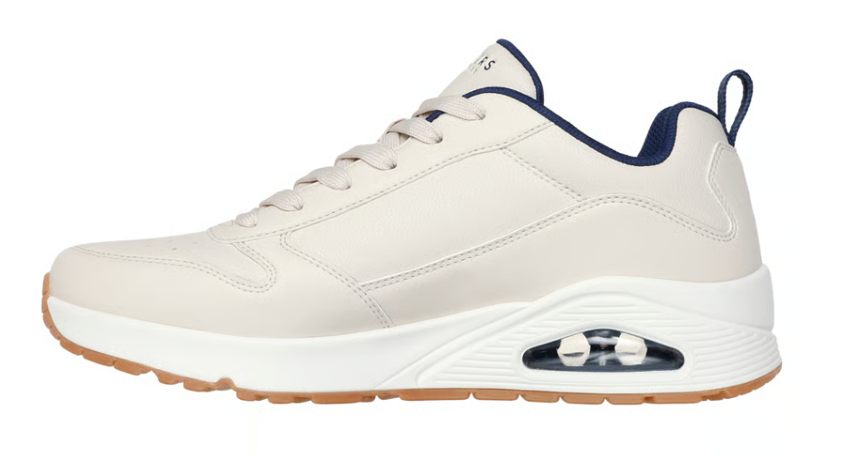 De Skechers Sneaker 183012 WBL UNO Alder Wit Blauw is een heerlijk comfortabele sneaker voor heren. Het bovenwerk van de schoen is gemaakt van wit/zandkleurig synthetisch materiaal met mooie perforatieaccenten die zorgen voor een verkoelend effect. De binnenkant van de sneaker is gemaakt van zwart textiel met een gewatteerde kraag en tong. Bovendien heeft de sneaker een Air-Cooled Memory Foam voetbed. Dit houdt in dat het voetbed gelijk comfort en goede demping geeft, maar daarnaast wel ademend blijft. Met memory foam voor een optimaal comfort. Verder heeft de sneaker een tussenzool met een zichtbaar air gedempt schokabsorberend hakkussen. Kortom een uiterst comfortabele sneaker. Tot slot heeft de schoen een flexibele gripzool voor de beste loopcomfort.