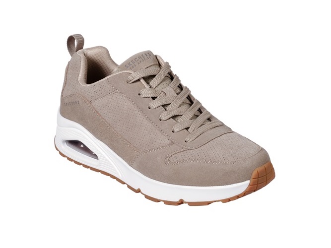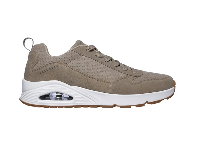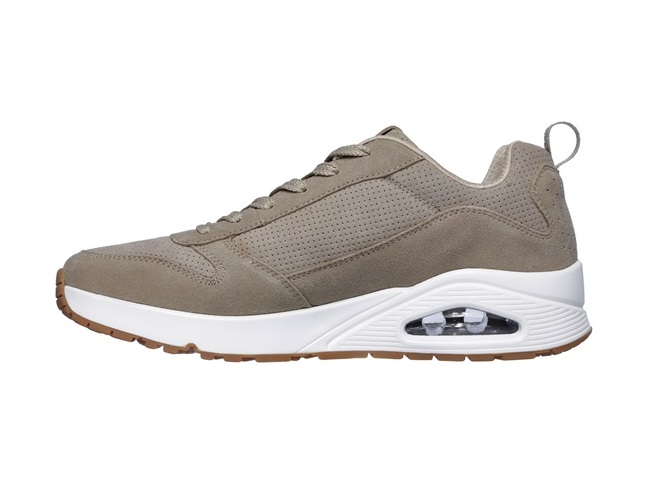 De Skechers Sneaker 52456 TPE UNO Taupe Suède is een heerlijk comfortabele sneaker voor heren. Het bovenwerk van de schoen is gemaakt van prachtig taupe kleurig suède leer met mooie perforatieaccenten die zorgen voor een verkoelend effect. De binnenkant van de sneaker is gemaakt van textiel met een gewatteerde kraag en tong. Bovendien heeft de sneaker een Air-Cooled Memory Foam voetbed. Dit houdt in dat het voetbed gelijk comfort en goede demping geeft, maar daarnaast wel ademend blijft. Met memory foam voor een optimaal comfort. Verder heeft de sneaker een tussenzool met een zichtbaar air gedempt schokabsorberend hakkussen. Kortom een uiterst comfortabele sneaker. Tot slot heeft de schoen een flexibele gripzool voor de beste loopcomfort.