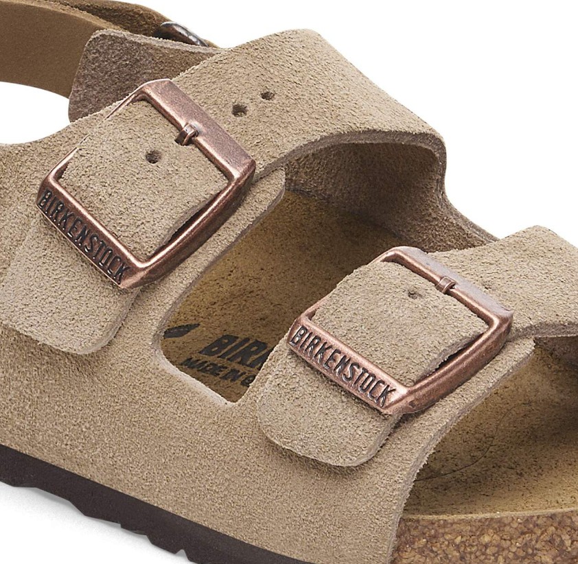 De Birkenstock Sandaal Milano AS 1029471 Taupe Smal is een sandaal met een fijn voorgevormd voetbed. De sandaal heeft drie individueel verstelbare banden voor een optimale pasvorm: 2 gespen over de voet en 1 klittenband achter de voet. Het boven- en binnenwerk is volledig van leer. De zool is gemaakt van het materiaal EVA*. Tot slot heeft hij een normale, tot smallere wijdte.