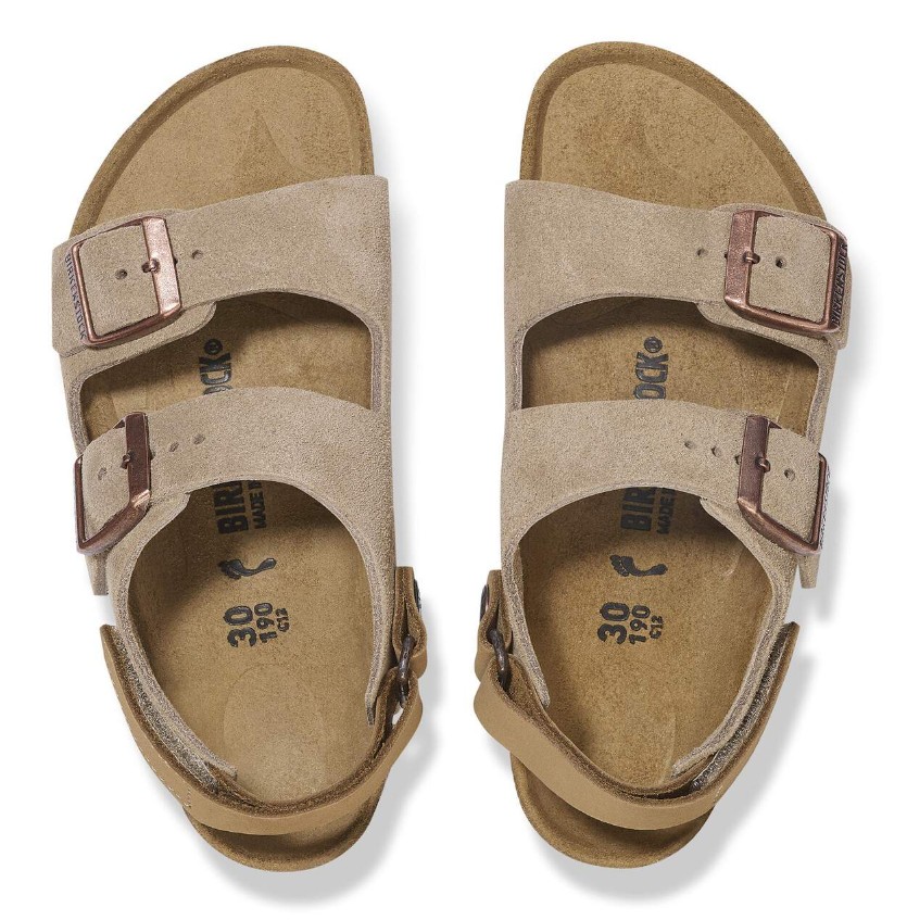 De Birkenstock Sandaal Milano AS 1029471 Taupe Smal is een sandaal met een fijn voorgevormd voetbed. De sandaal heeft drie individueel verstelbare banden voor een optimale pasvorm: 2 gespen over de voet en 1 klittenband achter de voet. Het boven- en binnenwerk is volledig van leer. De zool is gemaakt van het materiaal EVA*. Tot slot heeft hij een normale, tot smallere wijdte.