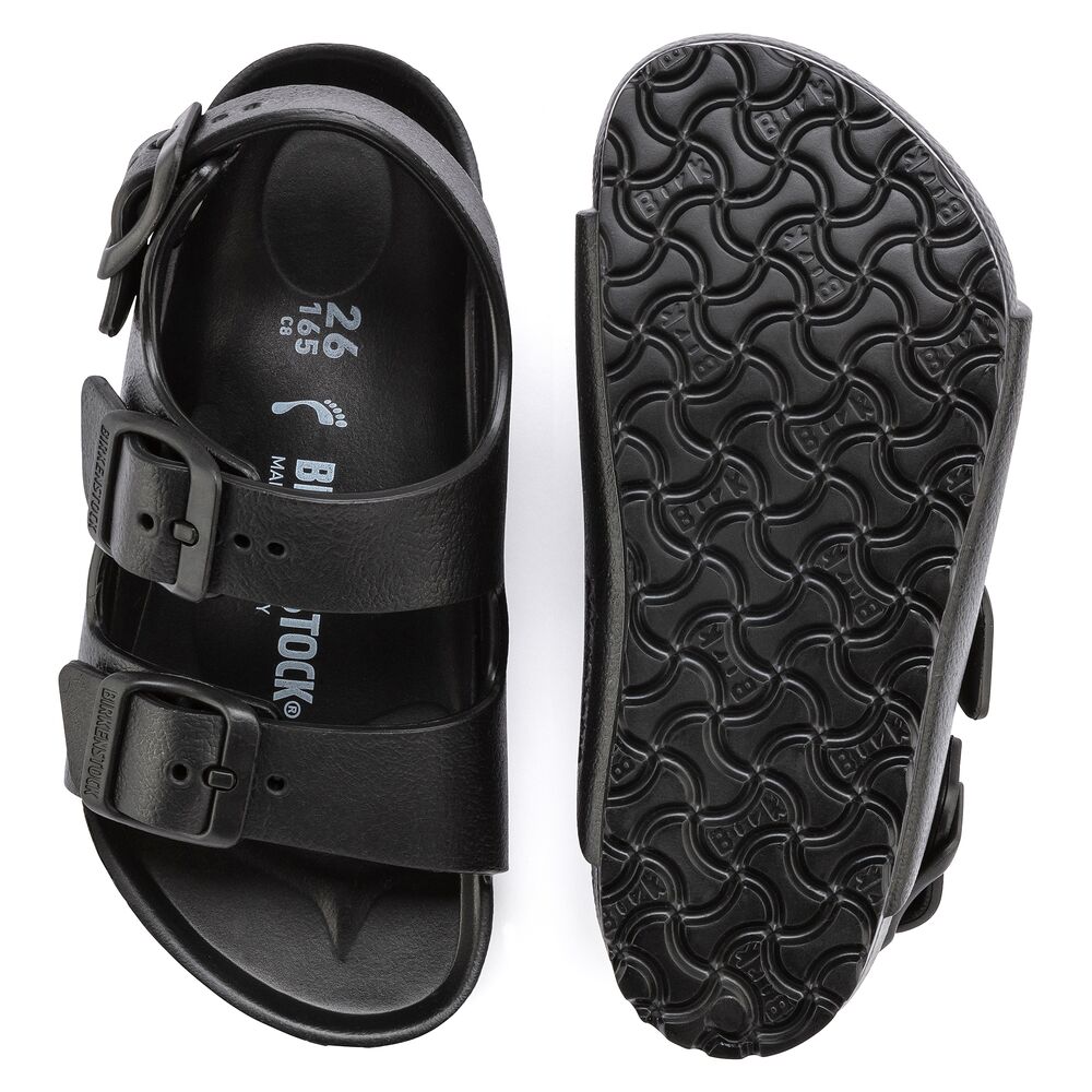 De Birkenstock Sandaal Milano 1009353 Smal, in de kleur zwart voor zowel jongens als meisjes, is een sportieve sandaal met een goed voetbed. De slipper is gemaakt van één materiaal, namelijk EVA*. Ideaal te verstellen voor optimale pasvorm. Verder heeft de sandaal een smaller voetbed.