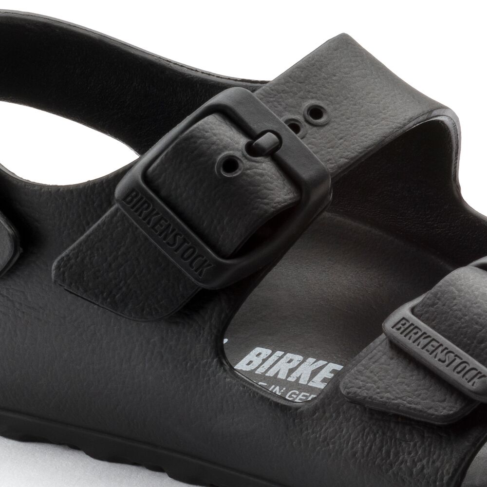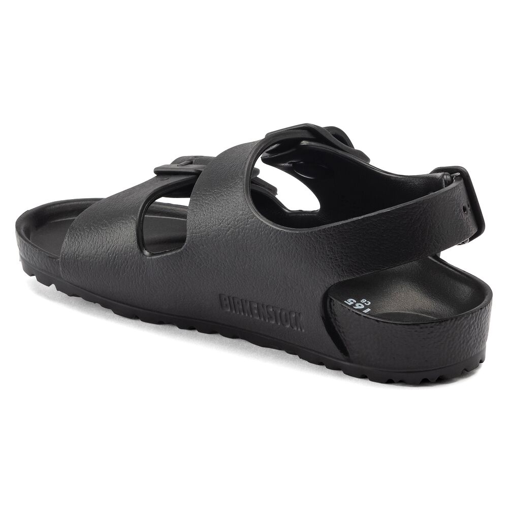 De Birkenstock Sandaal Milano 1009353 Smal, in de kleur zwart voor zowel jongens als meisjes, is een sportieve sandaal met een goed voetbed. De slipper is gemaakt van één materiaal, namelijk EVA*. Ideaal te verstellen voor optimale pasvorm. Verder heeft de sandaal een smaller voetbed.