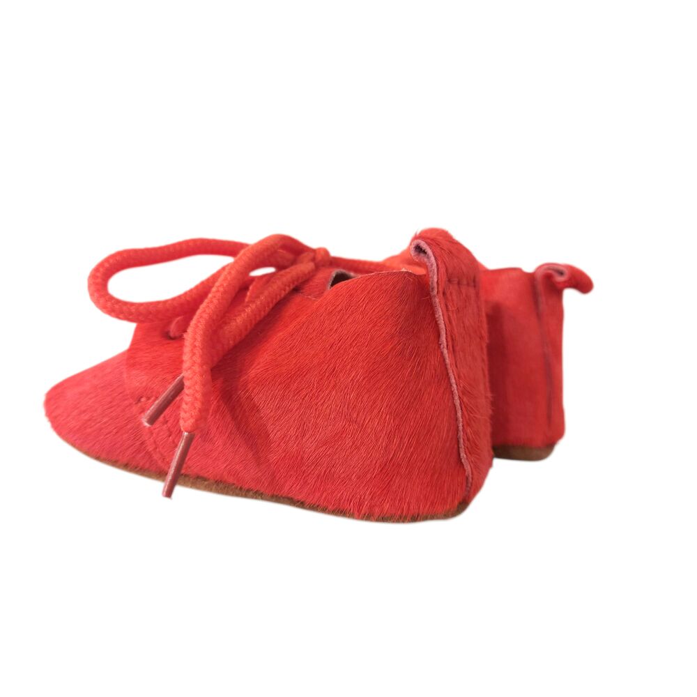 Het bovenwerk is gemaakt van soepel geitenleer in een mooie rode kleur. Dit leer voelt zacht aan en voelt als een pantoffeltje, maar is toch sterk en duurzaam. De binnenkant is volledig leer gevoerd, wat zorgt voor een comfortabel en ademend gevoel aan de voetjes. De schoen sluit met veters, zodat hij goed aansluit. Bovendien biedt het voetbed een stabiele basis.