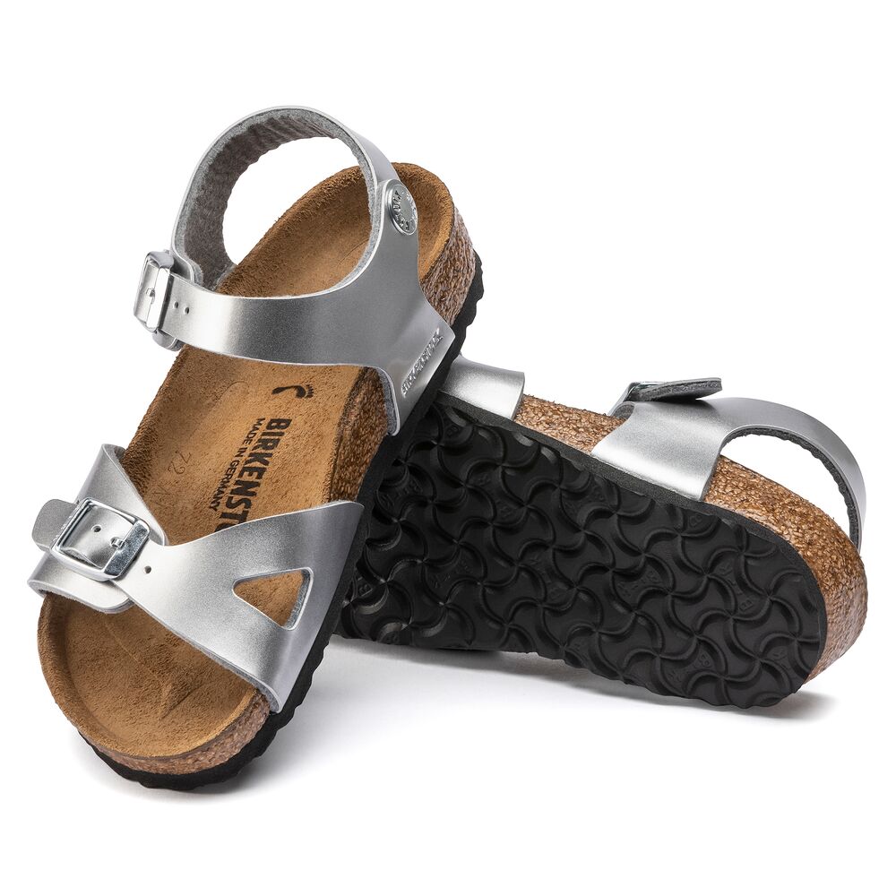 De Birkenstock Sandaal Rio 1019201 Metallic Zilver Smal, is een sandaal voor kinderen met een goed leren voetbed. De slipper heeft twee verstelbare banden voor een optimale pasvorm. Verder is zowel het bovenwerk als de voering gemaakt van Birko-Flor. De zool is gemaakt van het materiaal EVA*. De slipper heeft een normale, tot smalle wijdte.