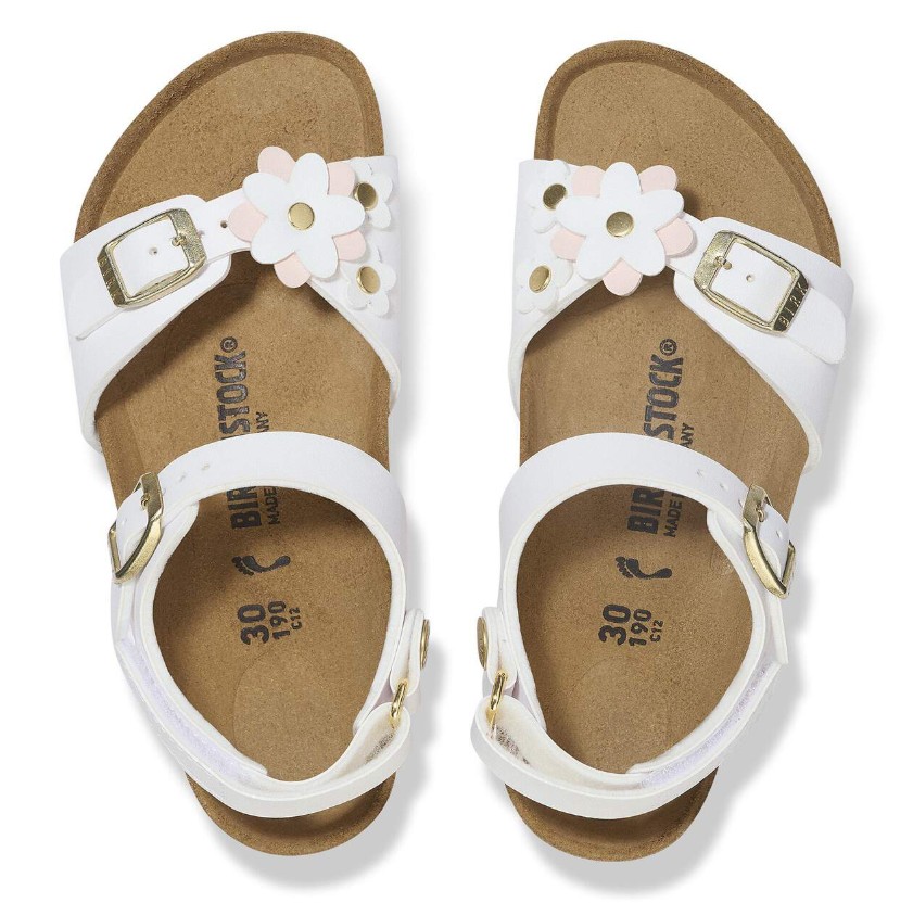 De Birkenstock Sandaal Rio Plain AS 1029561 White is een witte sandaal voor kinderen met een goed leren voetbed. De slipper heeft 3 verstelbare banden voor een optimale pasvorm, afgewerkt met wit en roze bloemen. De achterste band is verstelbaar met klittenband, ideaal voor kinderen om zelf aan te trekken. Verder is zowel het bovenwerk als de voering gemaakt van Birko-Flor. Het voetbed is van suède leer. De zool is gemaakt van het materiaal EVA*. De slipper heeft een normale, tot smalle wijdte.