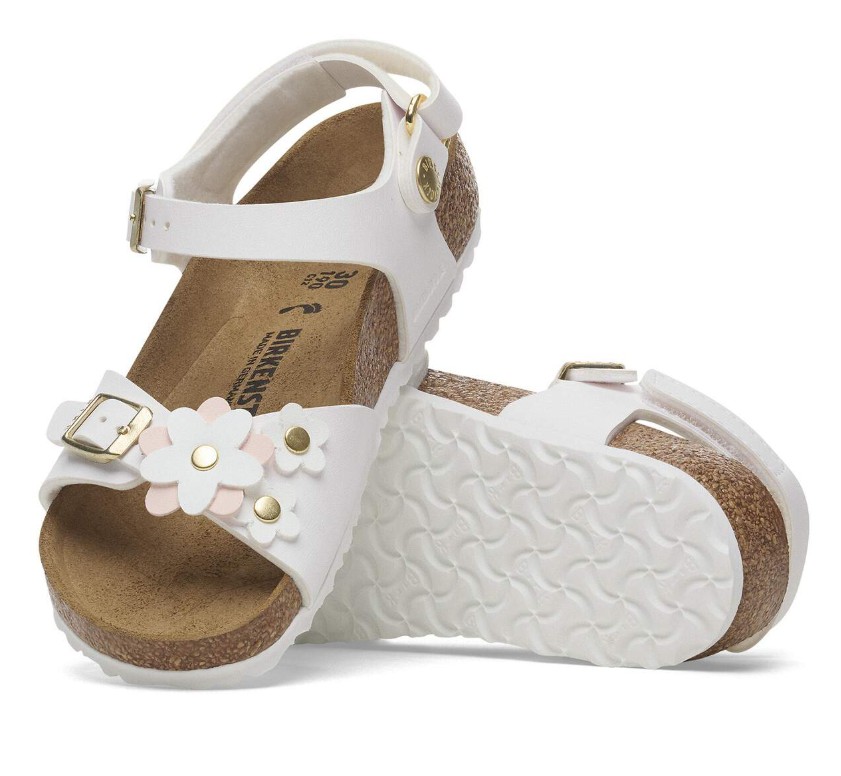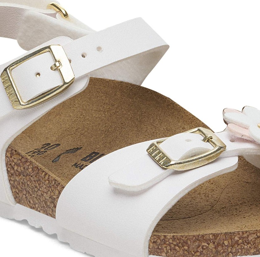 De Birkenstock Sandaal Rio Plain AS 1029561 White is een witte sandaal voor kinderen met een goed leren voetbed. De slipper heeft 3 verstelbare banden voor een optimale pasvorm, afgewerkt met wit en roze bloemen. De achterste band is verstelbaar met klittenband, ideaal voor kinderen om zelf aan te trekken. Verder is zowel het bovenwerk als de voering gemaakt van Birko-Flor. Het voetbed is van suède leer. De zool is gemaakt van het materiaal EVA*. De slipper heeft een normale, tot smalle wijdte.